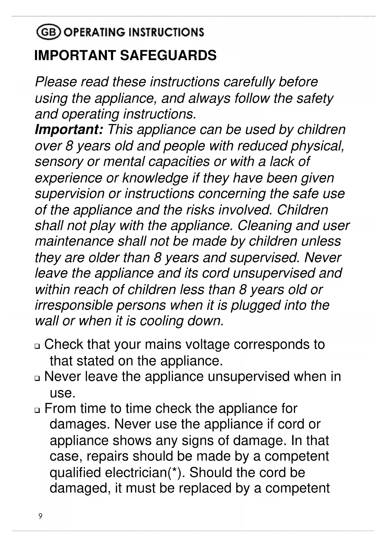 IMPORTANT SAFEGUARDS Please read these instructions carefully before using the appliance, and always follow the safety and operating instructions. Important: This appliance can be used by children over 8 years old and people with reduced physical, sensory or mental capacities or with a lack of experience or knowledge if they have been given supervision or instructions concerning the safe use of the appliance and the risks involved. Children shall not play with the appliance. Cleaning and user maintenance shall not be made by children unless they are older than 8 years and supervised. Never leave the appliance and its cord unsupervised and within reach of children less than 8 years old or irresponsible persons when it is plugged into the wall or when it is cooling down. Check that your mains voltage corresponds to that stated on the appliance. Never leave the appliance unsupervised when in use. From time to time check the appliance for damages. Never use the appliance if cord or appliance shows any signs of damage. In that case, repairs should be made by a competent qualified electrician(*). Should the cord be damaged, it must be replaced by a competent10