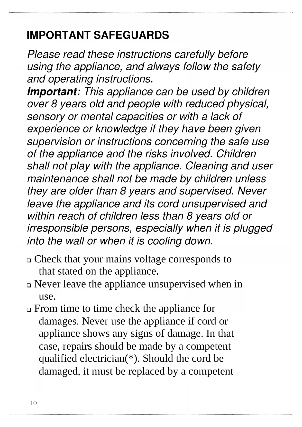 IMPORTANT SAFEGUARDS Please read these instructions carefully before using the appliance, and always follow the safety and operating instructions. Important: This appliance can be used by children over 8 years old and people with reduced physical, sensory or mental capacities or with a lack of experience or knowledge if they have been given supervision or instructions concerning the safe use of the appliance and the risks involved. Children shall not play with the appliance. Cleaning and user maintenance shall not be made by children unless they are older than 8 years and supervised. Never leave the appliance and its cord unsupervised and within reach of children less than 8 years old or irresponsible persons, especially when it is plugged into the wall or when it is cooling down. Check that your mains voltage corresponds to that stated on the appliance. Never leave the appliance unsupervised when in use. From time to time check the appliance for damages. Never use the appliance if cord or appliance shows any signs of damage. In that case, repairs should be made by a competent qualified electrician(*). Should the cord be damaged, it must be replaced by a competent11