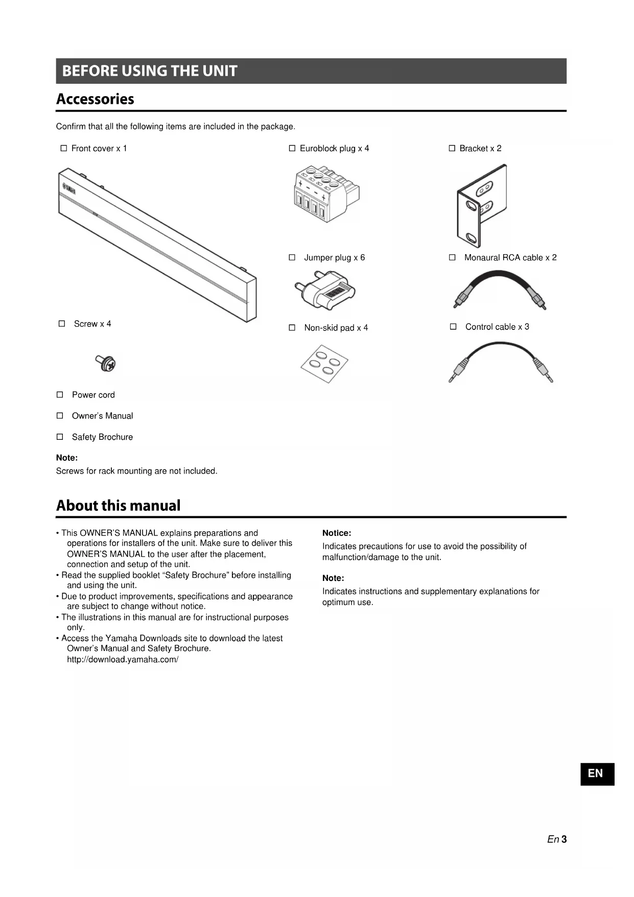- Access the Yamaha Downloads site to download the latest Owner’s Manual and Safety Brochure. http://download.yamaha.com/ Notice: Indicates precautions for use to avoid the possibility of malfunction/damage to the unit. Note: Indicates instructions and supplementary explanations for optimum use.