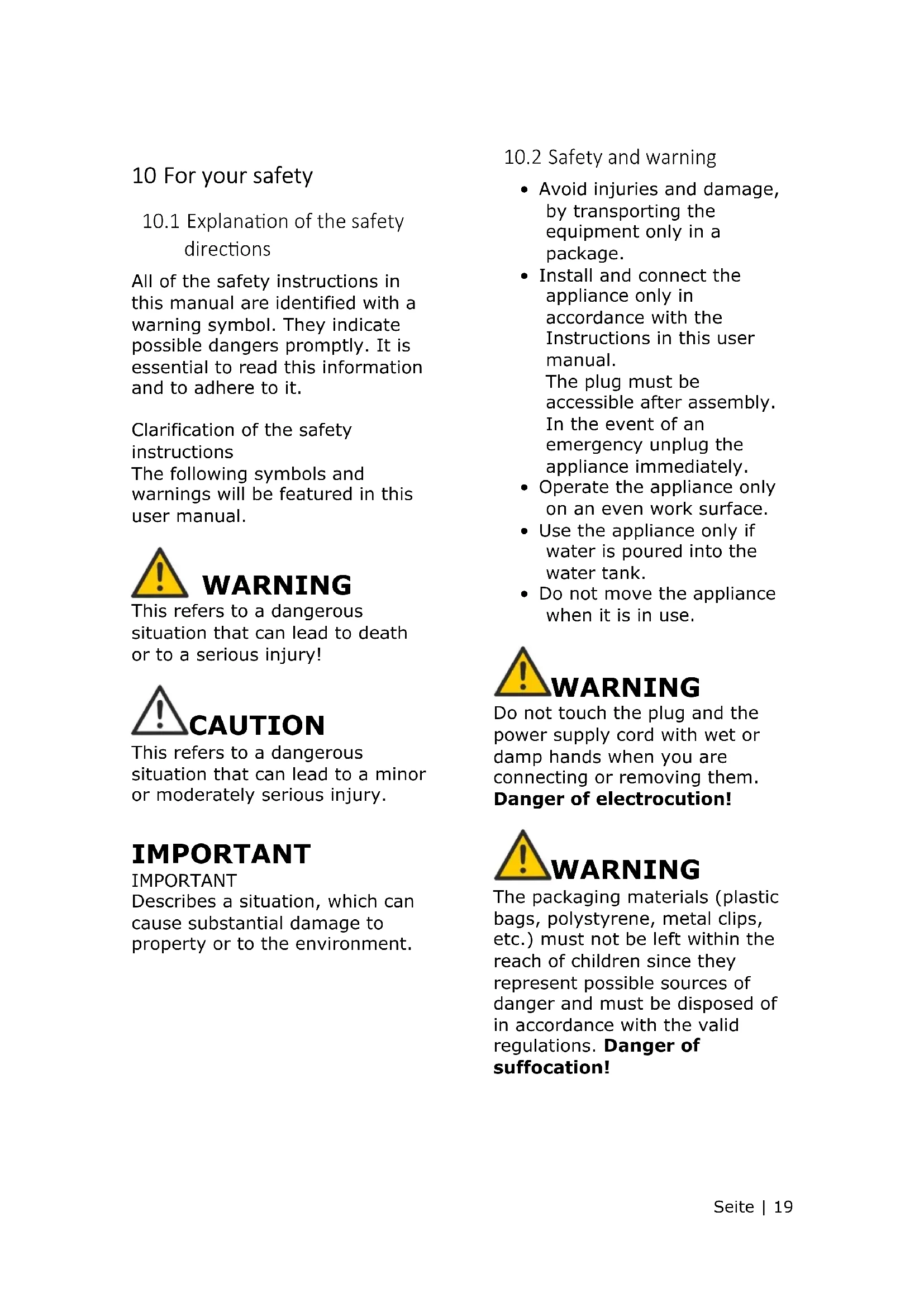 - Do not move the appliance when it is in use. WARNING Do not touch the plug and the power supply cord with wet or damp hands when you are connecting or removing them. Danger of electrocution! WARNING The packaging materials (plastic bags, polystyrene, metal clips, etc.) must not be left within the reach of children since they represent possible sources of danger and must be disposed of in accordance with the valid regulations. Danger of suffocation!Seite | 20