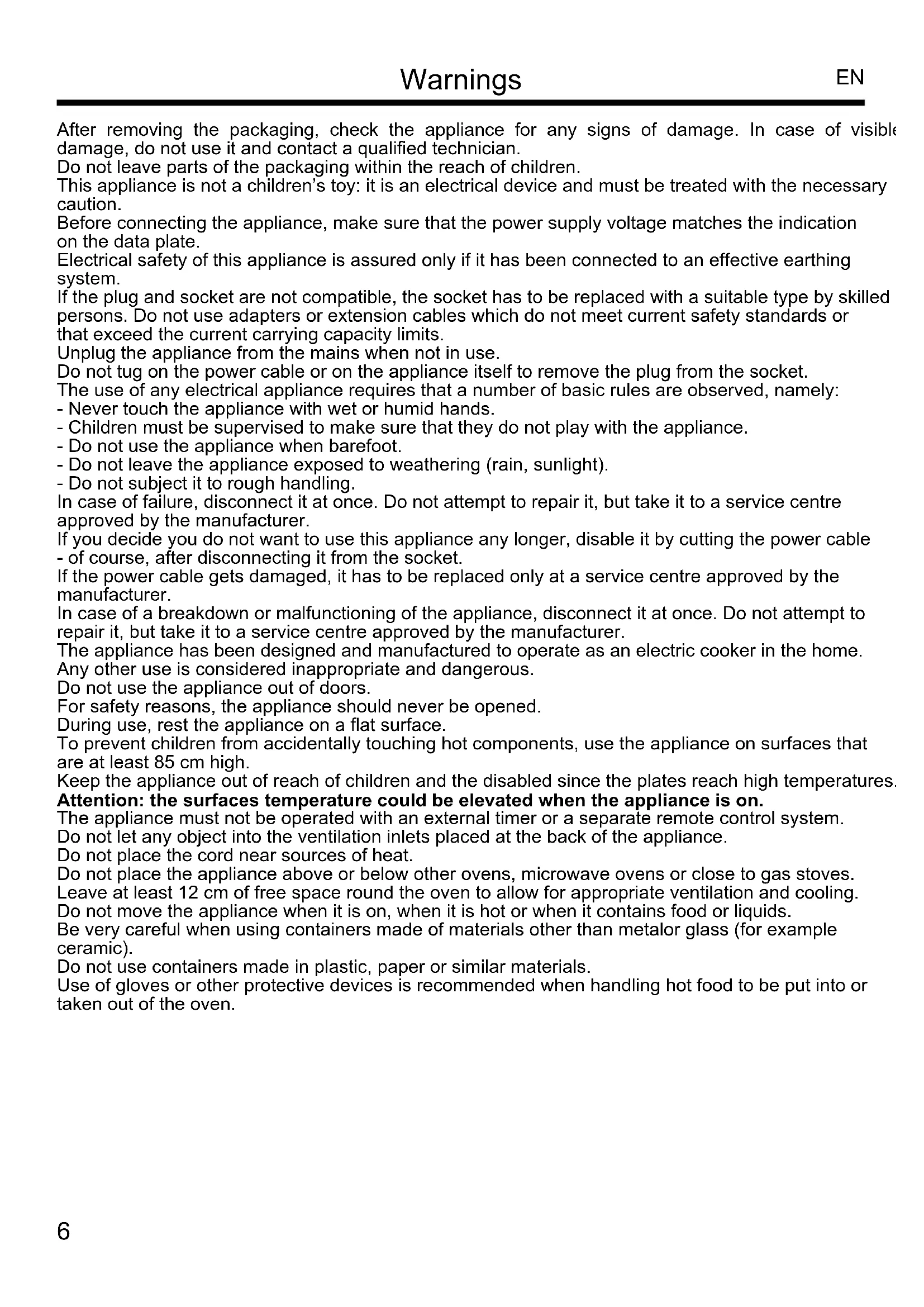 The appliance has been designed and manufactured to operate as an electric cooker in the home.