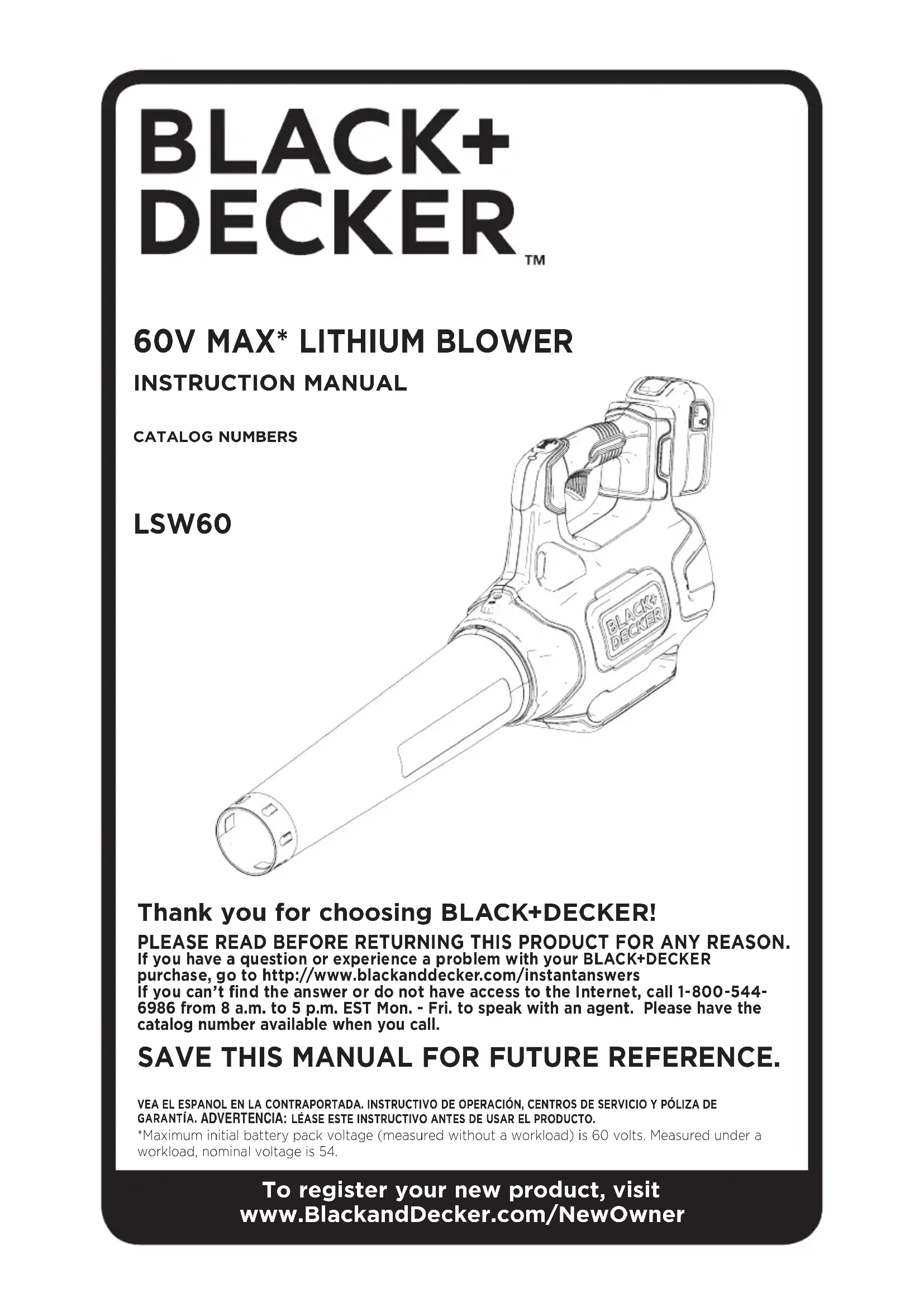 CATALOG NUMBERS Thank you for choosing BLACK+DECKER! PLEASE READ BEFORE RETURNING THIS PRODUCT FOR ANY REASON. If you have a question or experience a problem with your BLACK+DECKER purchase, go to http://www.blackanddecker.com/instantanswers If you can’t find the answer or do not have access to the Internet, call 1-800-544- 6986 from 8 a.m. to 5 p.m. EST Mon. - Fri. to speak with an agent. Please have the catalog number available when you call. SAVE THIS MANUAL FOR FUTURE REFERENCE. VEA EL ESPANOL EN LA CONTRAPORTADA. INSTRUCTIVO DE OPERACIÓN, CENTROS DE SERVICIO Y PÓLIZA DE GARANTÍA. ADVERTENCIA: LÉASE ESTE INSTRUCTIVO ANTES DE USAR EL PRODUCTO.*Maximum initial battery pack voltage (measured without a workload) is 60 volts. Measured under a workload, nominal voltage is 54. To register your new product, visit www.BlackandDecker.com/NewOwner LSW602 IMPORTANT SAFETY WARNINGS & INSTRUCTIONS