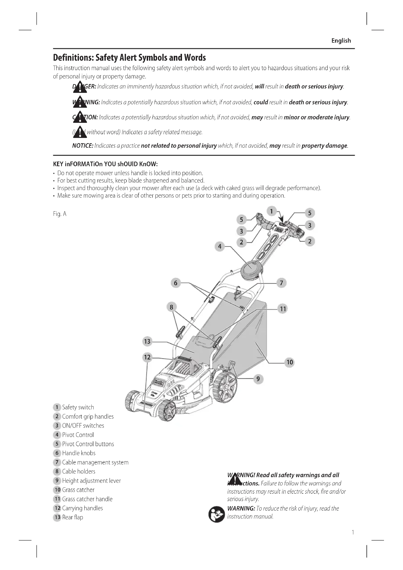 - Check grass catcher components and the discharge guard frequently and when necessary replace with BLACK+DECKER recommended parts only.