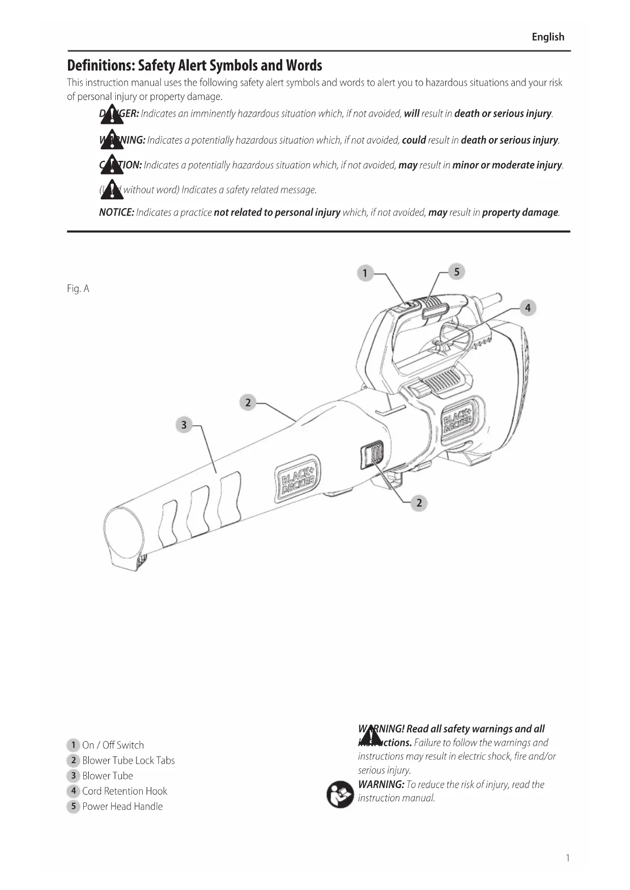 of it. Damage or personal injury couldresult. Refer to Figure A at the beginning of this manual for a complete list ofcomponents. INTENDED USE This appliance is designed for household outdoor blowerapplications. DO nOT use under wet conditions or in presence of flammable liquids orgases. DO nOT let children come into contact with the tool. Supervision is required when inexperienced operators use thistool.