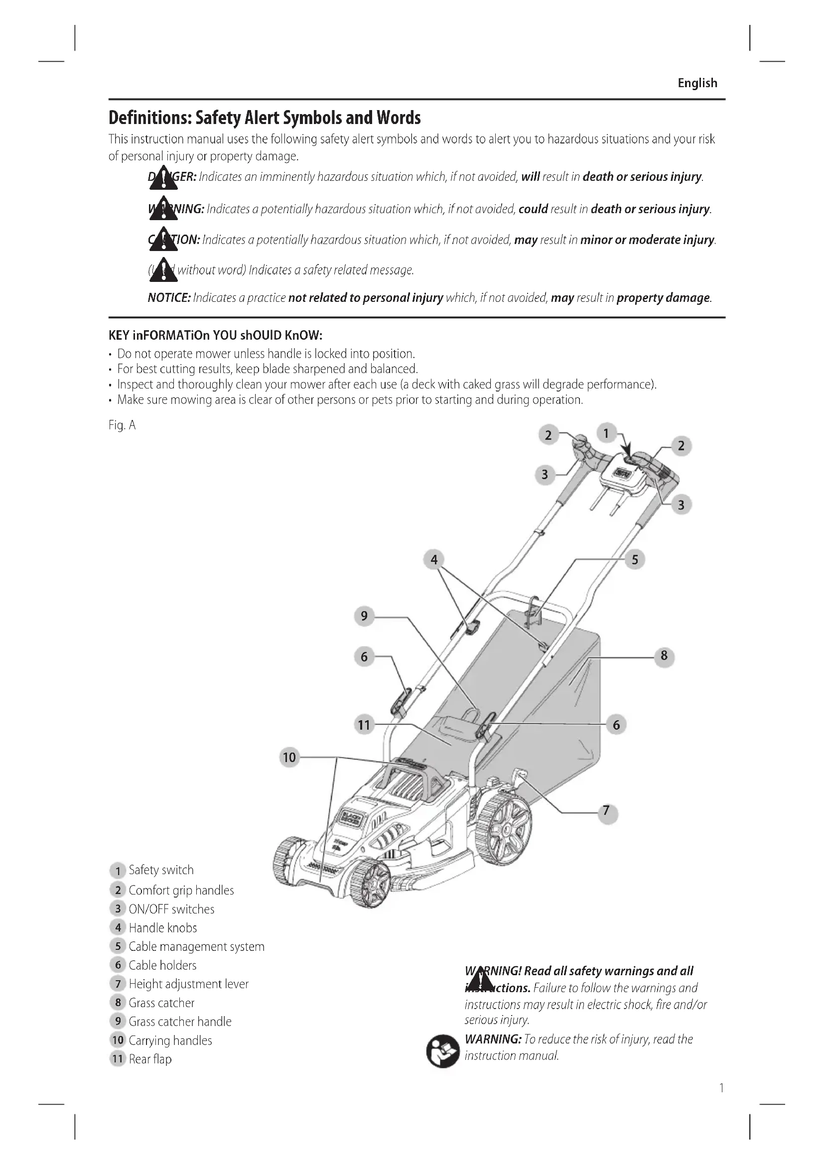 - Make sure mowing area is clear of other persons or pets prior to starting and during operation. Fig. A