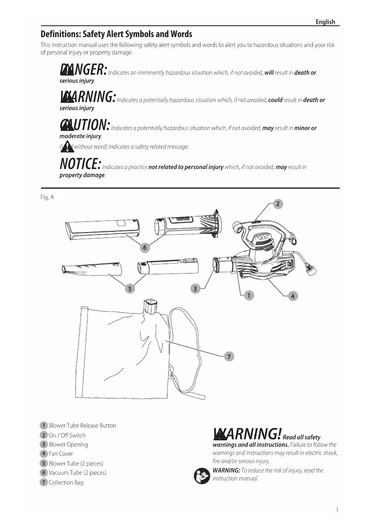 Collection Bag Definitions: Safety Alert Symbols and Words This instruction manual uses the following safety alert symbols and words to alert you to hazardous situations and your risk of personal injury or property damage.