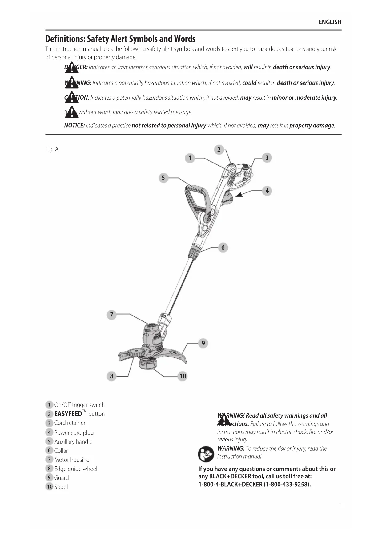 of it. Damage or personal injury couldresult. Refer to Fig. A at the beginning of this manual for a complete list ofcomponents. Intended Use This appliance is designed for residential outdoor trimmingapplications. DO NOT use under wet conditions or in presence of flammable liquids orgases. DO NOT let children come into contact with the tool. Supervision is required when inexperienced operators use thistool.