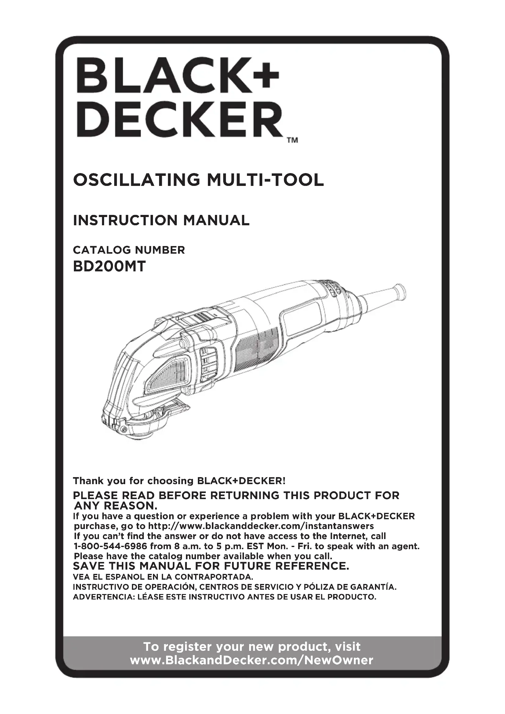 INSTRUCTION MANUAL OSCILLATING MULTI-TOOL Thank you for choosing BLACK+DECKER! PLEASE READ BEFORE RETURNING THIS PRODUCT FOR ANY REASON. If you have a question or experience a problem with your BLACK+DECKER purchase, go to http://www.blackanddecker.com/instantanswers If you can’t find the answer or do not have access to the Internet, call 1-800-544-6986 from 8 a.m. to 5 p.m. EST Mon. - Fri. to speak with an agent. Please have the catalog number available when you call. SAVE THIS MANUAL FOR FUTURE REFERENCE. VEA EL ESPANOL EN LA CONTRAPORTADA.INSTRUCTIVO DE OPERACIÓN, CENTROS DE SERVICIO Y PÓLIZA DE GARANTÍA. ADVERTENCIA: LÉASE ESTE INSTRUCTIVO ANTES DE USAR EL PRODUCTO. CATALOG NUMBER BD200MT To register your new product, visit www.BlackandDecker.com/NewOwner2 General Power Tool Safety Warnings