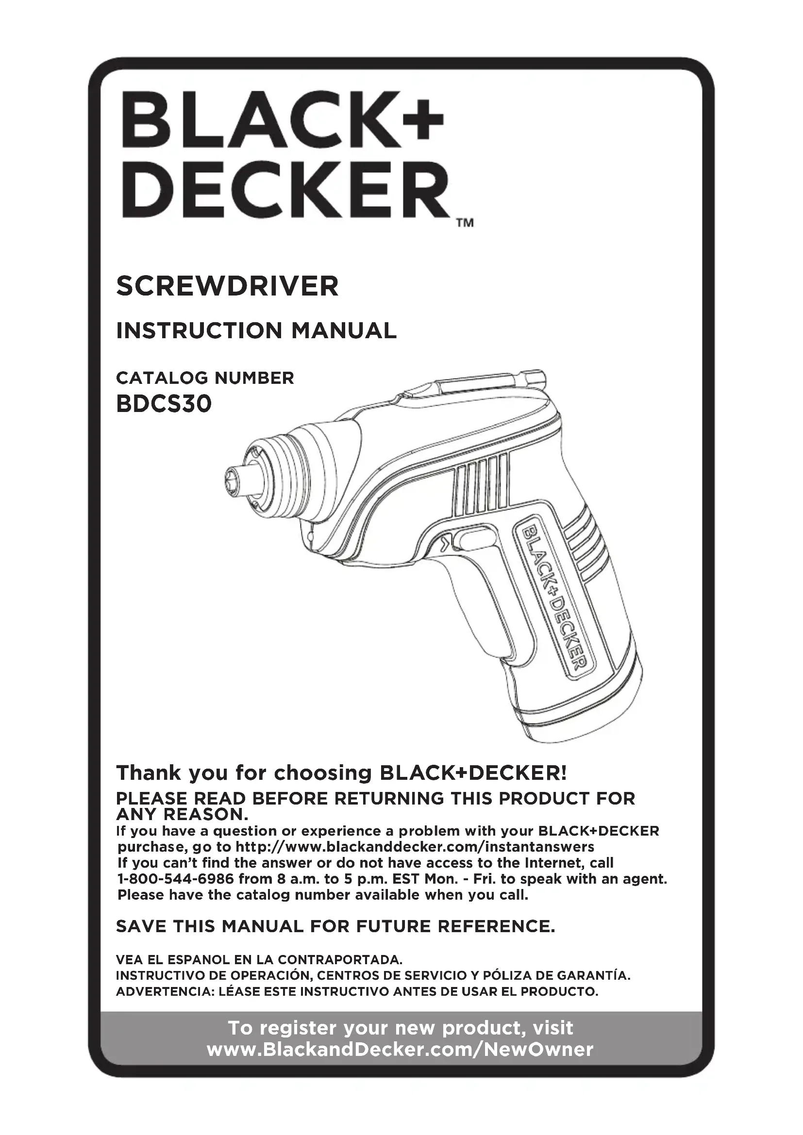 INSTRUCTION MANUAL SCREWDRIVER Thank you for choosing BLACK+DECKER! PLEASE READ BEFORE RETURNING THIS PRODUCT FOR ANY REASON. If you have a question or experience a problem with your BLACK+DECKER purchase, go to http://www.blackanddecker.com/instantanswers If you can’t find the answer or do not have access to the Internet, call 1-800-544-6986 from 8 a.m. to 5 p.m. EST Mon. - Fri. to speak with an agent. Please have the catalog number available when you call.SAVE THIS MANUAL FOR FUTURE REFERENCE.VEA EL ESPANOL EN LA CONTRAPORTADA.INSTRUCTIVO DE OPERACIÓN, CENTROS DE SERVICIO Y PÓLIZA DE GARANTÍA. ADVERTENCIA: LÉASE ESTE INSTRUCTIVO ANTES DE USAR EL PRODUCTO.CATALOG NUMBER BDCS30 To register your new product, visit www.BlackandDecker.com/NewOwner2