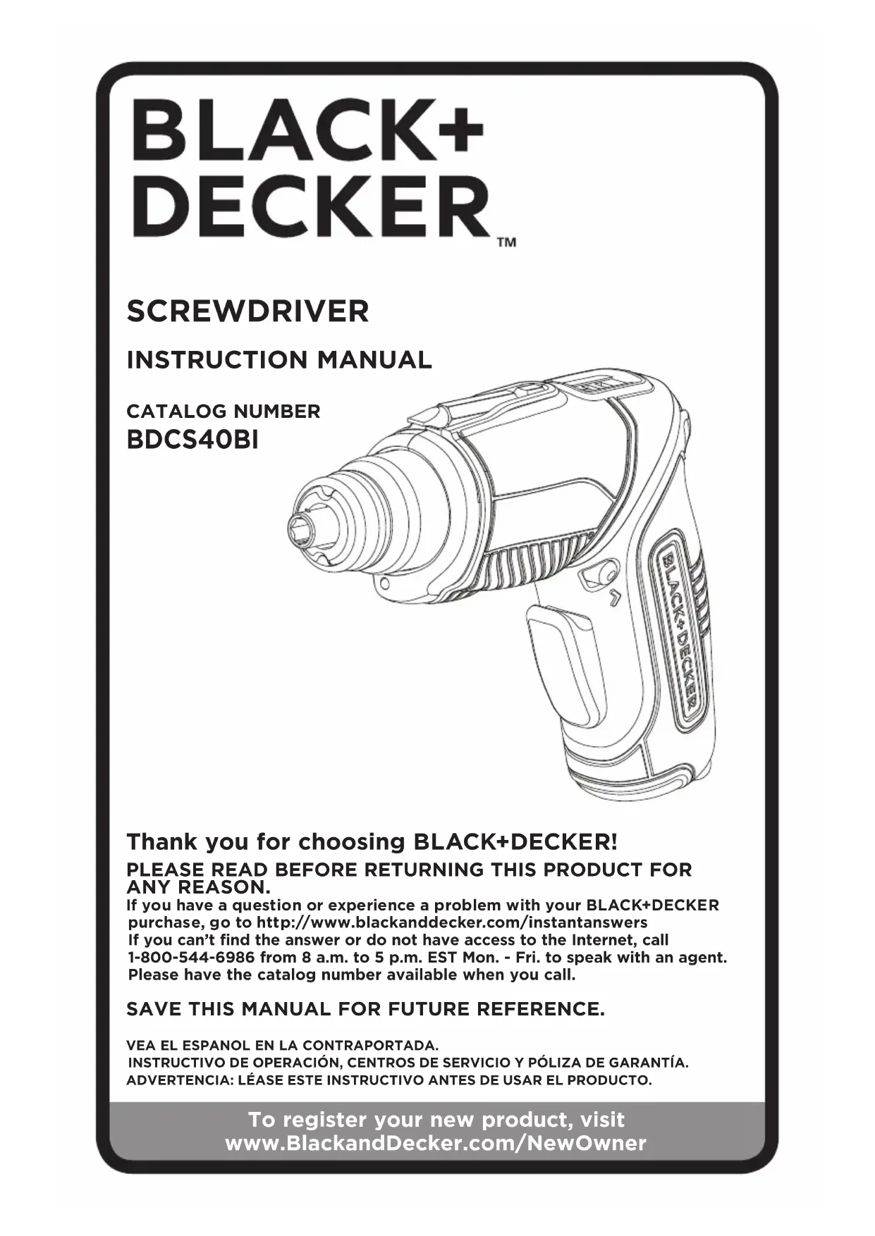 INSTRUCTION MANUAL SCREWDRIVER Thank you for choosing BLACK+DECKER! PLEASE READ BEFORE RETURNING THIS PRODUCT FOR ANY REASON. If you have a question or experience a problem with your BLACK+DECKER purchase, go to http://www.blackanddecker.com/instantanswers If you can’t find the answer or do not have access to the Internet, call 1-800-544-6986 from 8 a.m. to 5 p.m. EST Mon. - Fri. to speak with an agent. Please have the catalog number available when you call.SAVE THIS MANUAL FOR FUTURE REFERENCE.VEA EL ESPANOL EN LA CONTRAPORTADA.INSTRUCTIVO DE OPERACIÓN, CENTROS DE SERVICIO Y PÓLIZA DE GARANTÍA. ADVERTENCIA: LÉASE ESTE INSTRUCTIVO ANTES DE USAR EL PRODUCTO.CATALOG NUMBER BDCS40BI To register your new product, visit www.BlackandDecker.com/NewOwner2
