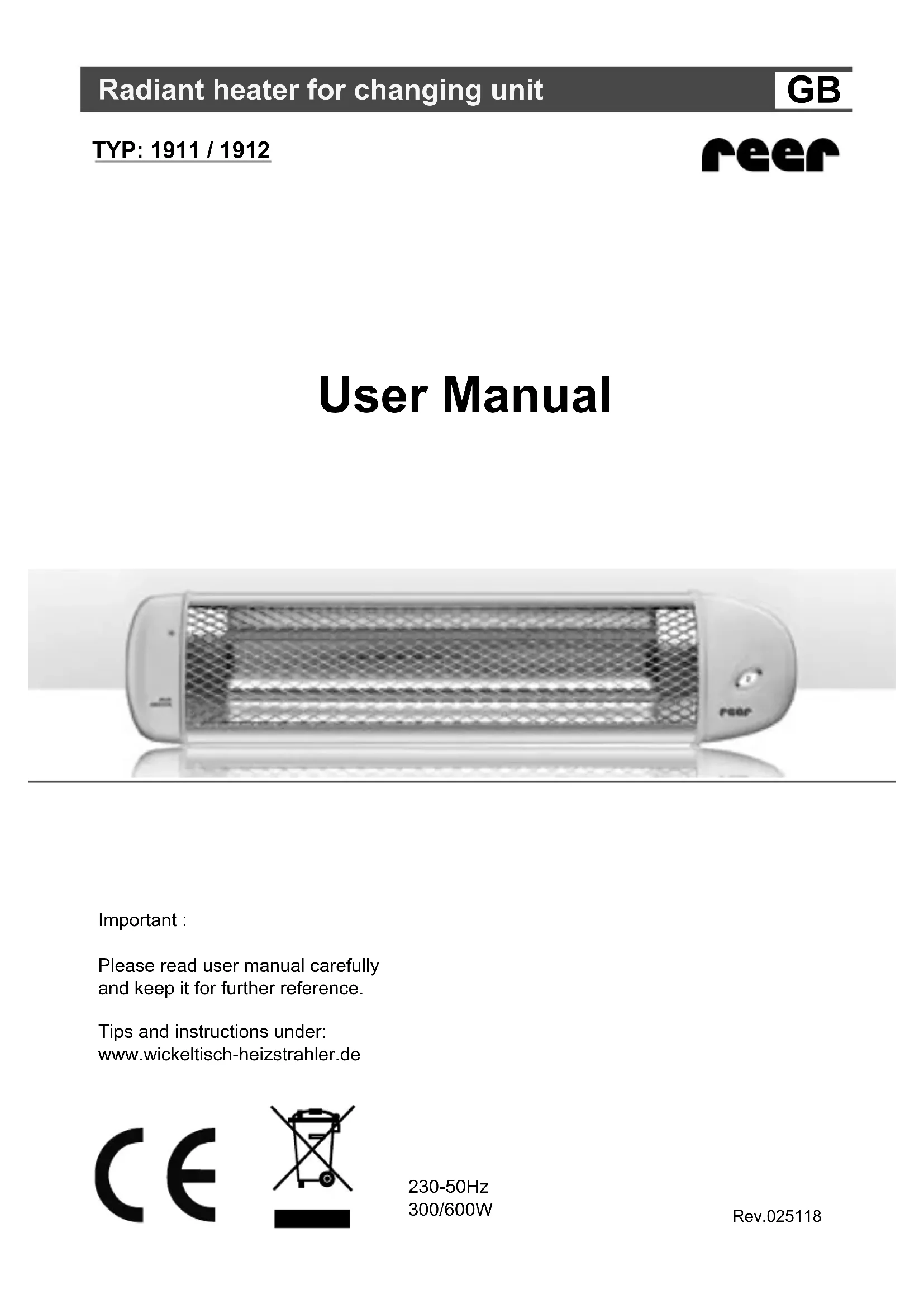 230-50Hz 300/600W Rev.025118Our changing unit radiant heater provides comforting direct heat in the area of changing units. It is also suitable for quick heating of bathrooms, hobby rooms, hallways, sheltered patios and balconies though. Important remarks :