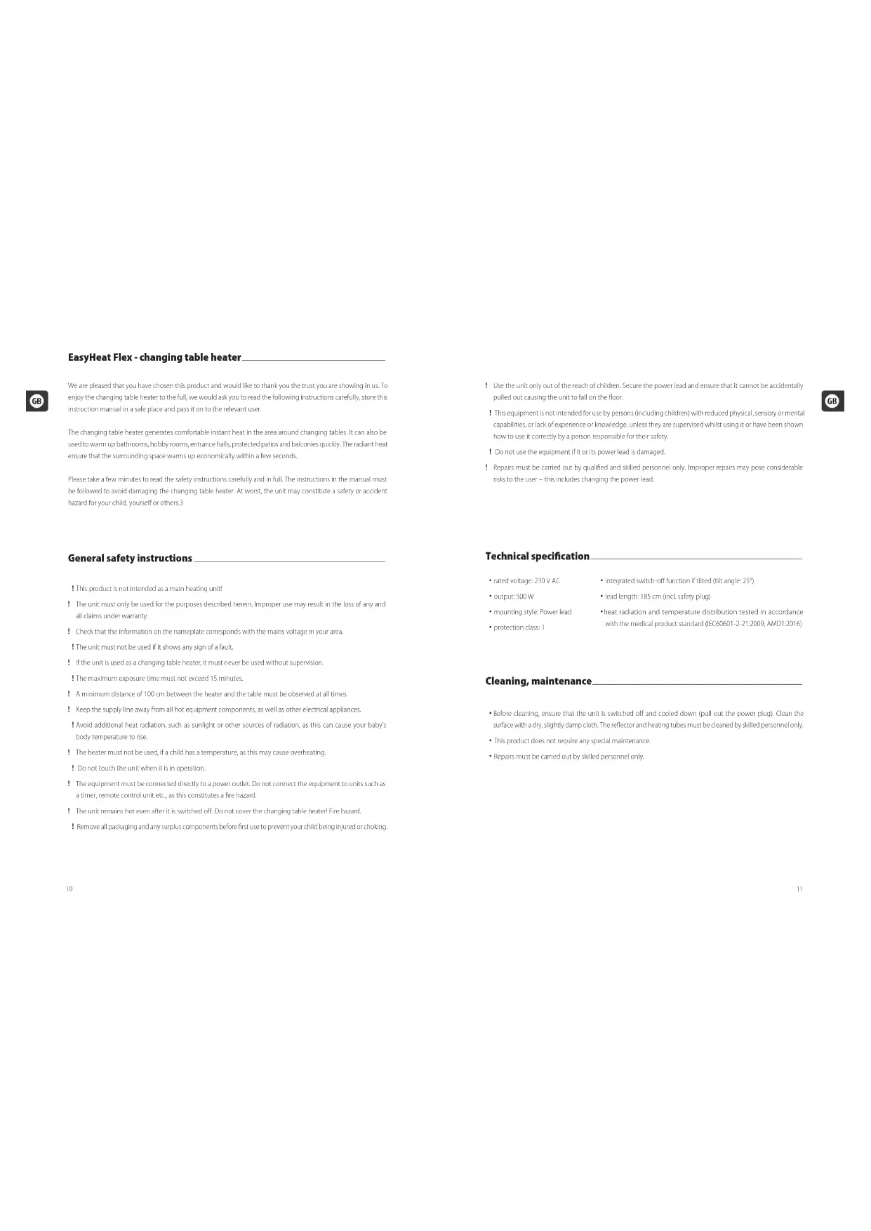 Stellen Sie den Wickeltisch-Wärme- strahler an den gewünschten Ort unter Berücksichtigung der Mindestabstände im Raum und außer Reichweite der Kinder auf. Stellen Sie sicher, dass der Standfuß kippsicher auf einem geraden Untergrund steht.1110 EasyHeat Flex - changing table heater We are pleased that you have chosen this product and would like to thank you the trust you are showing in us. To enjoy the changing table heater to the full, we would ask you to read the following instructions carefully, store this instruction manual in a safe place and pass it on to the relevant user. The changing table heater generates comfortable instant heat in the area around changing tables. It can also be used to warm up bathrooms, hobby rooms, entrance halls, protected patios and balconies quickly. The radiant heat ensure that the surrounding space warms up economically within a few seconds. Please take a few minutes to read the safety instructions carefully and in full. The instructions in the manual must be followed to avoid damaging the changing table heater. At worst, the unit may constitute a safety or accident hazard for your child, yourself or others.3 General safety instructions ! This product is not intended as a main heating unit! ! The unit must only be used for the purposes described herein. Improper use may result in the loss of any and all claims under warranty. ! Check that the information on the nameplate corresponds with the mains voltage in your area. ! The unit must not be used if it shows any sign of a fault. ! If the unit is used as a changing table heater, it must never be used without supervision. ! The maximum exposure time must not exceed 15 minutes. ! A minimum distance of 100 cm between the heater and the table must be observed at all times. ! Keep the supply line away from all hot equipment components, as well as other electrical appliances.