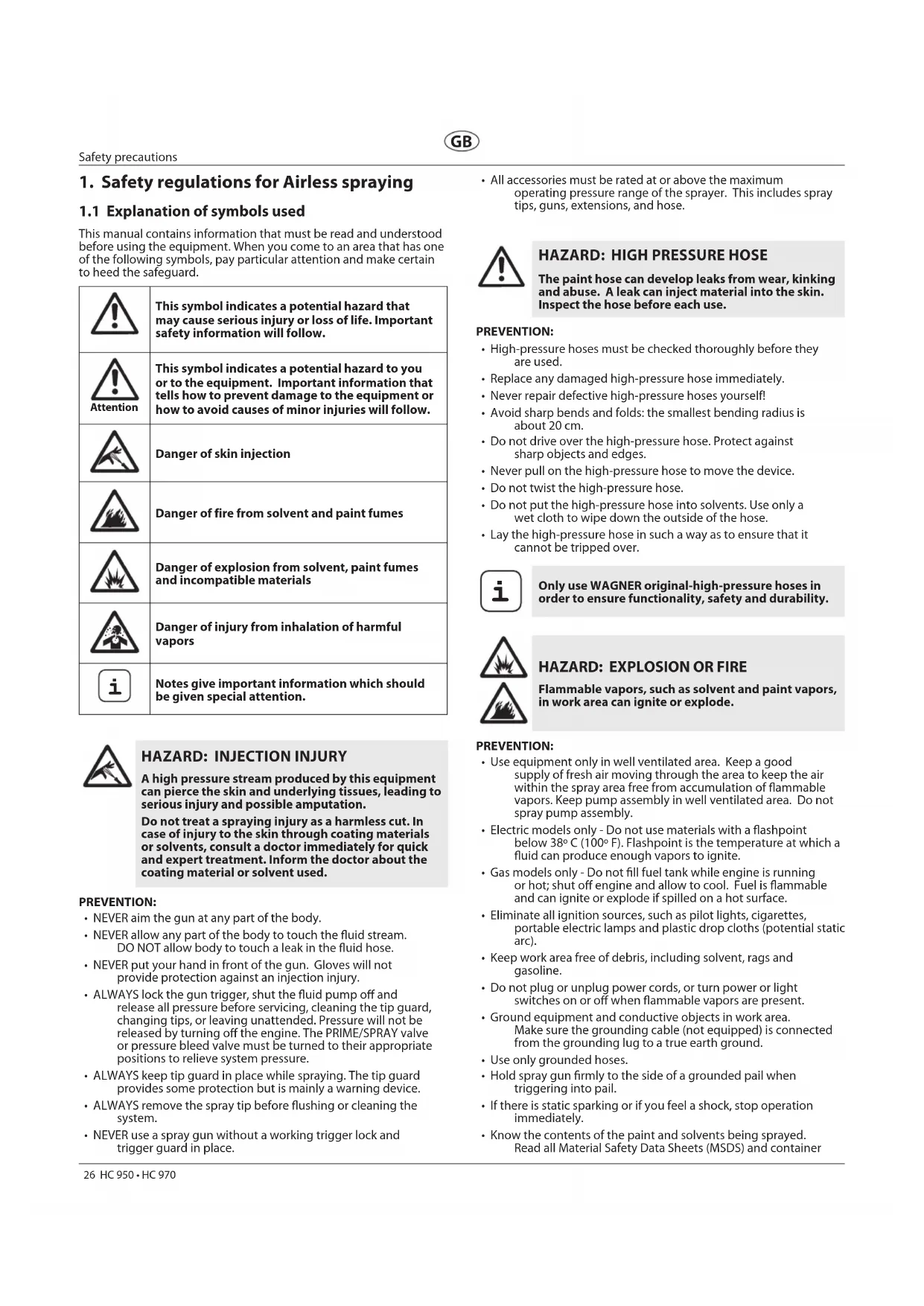 Never put your ngers, hands or any other parts of the body into the spray jet! Never point the spray gun at yourself, other persons or animals. Never use the spray gun without safety guard. Do not treat a spraying injury as a harmless cut. In case of injury to the skin through coating materials or solvents, consult a doctor immediately for quick and expert treatment. Inform the doctor about the coating material or solvent used. The operating instructions state that the following points must always be observed before starting up: 1. Faulty units must not be used. 2. Secure WAGNER spray gun using the safety catch on the trigger. 3. Ensure that the unit is properly earthed. 4. Check allowable operating pressure of high-pressure hose and spray gun. 5. Check all connections for leaks. The instructions regarding regular cleaning and maintenance of the unit must be strictly observed. Before any work is done on the unit or for every break in work the following rules must be observed: 1. Release the pressure from spray gun and hose. 2. Secure the WAGNER spray gun using the safety catch on the trigger. 3. Switch o unit.Original Operating ManualHC 950 • HC 970 25