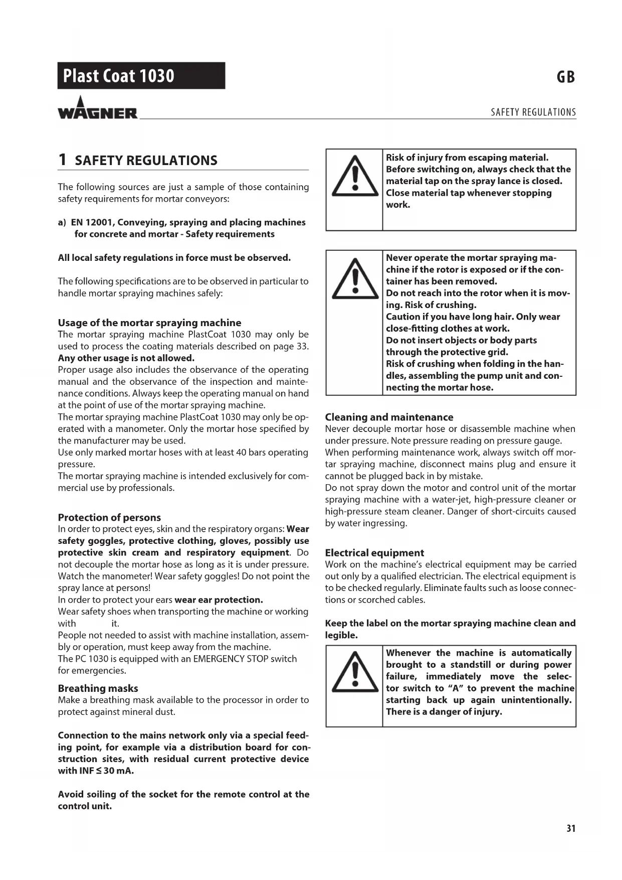 1 SAFETY REGULATIONS The following sources are just a sample of those containing safety requirements for mortar conveyors: a) EN 12001, Conveying, spraying and placing machines for concrete and mortar - Safety requirements All local safety regulations in force must be observed. The following specications are to be observed in particular to handle mortar spraying machines safely: Usage of the mortar spraying machine The mortar spraying machine PlastCoat 1030 may only be used to process the coating materials described on page 33. Any other usage is not allowed. Proper usage also includes the observance of the operating manual and the observance of the inspection and mainte- nance conditions. Always keep the operating manual on hand at the point of use of the mortar spraying machine. The mortar spraying machine PlastCoat 1030 may only be op- erated with a manometer. Only the mortar hose specied by the manufacturer may be used. Use only marked mortar hoses with at least 40 bars operating pressure. The mortar spraying machine is intended exclusively for com- mercial use by professionals. Protection of persons In order to protect eyes, skin and the respiratory organs: Wear safety goggles, protective clothing, gloves, possibly use protective skin cream and respiratory equipment. Do not decouple the mortar hose as long as it is under pressure. Watch the manometer! Wear safety goggles! Do not point the spray lance at persons! In order to protect your ears wear ear protection. Wear safety shoes when transporting the machine or working with it. People not needed to assist with machine installation, assem- bly or operation, must keep away from the machine. The PC 1030 is equipped with an EMERGENCY STOP switch for emergencies. Breathing masks Make a breathing mask available to the processor in order to protect against mineral dust. Connection to the mains network only via a special feed- ing point, for example via a distribution board for con- struction sites, with residual current protective device with INF ≤ 30 mA. Avoid soiling of the socket for the remote control at the control unit. Risk of injury from escaping material. Before switching on, always check that the material tap on the spray lance is closed. Close material tap whenever stopping work. Never operate the mortar spraying ma- chine if the rotor is exposed or if the con- tainer has been removed. Do not reach into the rotor when it is mov- ing. Risk of crushing. Caution if you have long hair. Only wear close-tting clothes at work. Do not insert objects or body parts through the protective grid. Risk of crushing when folding in the han- dles, assembling the pump unit and con- necting the mortar hose. Cleaning and maintenance Never decouple mortar hose or disassemble machine when under pressure. Note pressure reading on pressure gauge. When performing maintenance work, always switch o mor- tar spraying machine, disconnect mains plug and ensure it cannot be plugged back in by mistake. Do not spray down the motor and control unit of the mortar spraying machine with a water-jet, high-pressure cleaner or high-pressure steam cleaner. Danger of short-circuits caused by water ingressing. Electrical equipment Work on the machine’s electrical equipment may be carried out only by a qualified electrician. The electrical equipment is to be checked regularly. Eliminate faults such as loose connec- tions or scorched cables. Keep the label on the mortar spraying machine clean and legible. Whenever the machine is automatically brought to a standstill or during power failure, immediately move the selec- tor switch to “A” to prevent the machine starting back up again unintentionally. There is a danger of injury. SAFETY REGULATIONS32 Plast Coat 1030