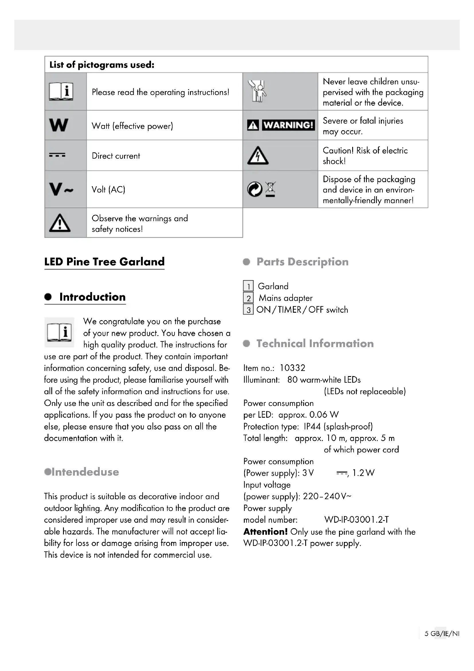 ON / TIMER / OFF switch Technical Information Item no.: 10332 Illuminant: 80 warm-white LEDs (LEDs not replaceable) Power consumption per LED: approx. 0.06 W Protection type: IP44 (splash-proof) Total length: approx. 10 m, approx. 5 m of which power cord Power consumption (Power supply): 3 V , 1.2 W Input voltage (power supply): 220–240 V∼ Power supply model number: WD-IP-03001.2-T Attention! Only use the pine garland with the WD-IP-03001.2-T power supply. List of pictograms used: Please read the operating instructions! Never leave children unsu- pervised with the packaging material or the device. Watt (effective power) Severe or fatal injuries may occur. Direct current Caution! Risk of electric shock! Volt (AC) Dispose of the packaging and device in an environ- mentally-friendly manner! Observe the warnings and safety notices!6 GB/IE/NI Scope of delivery 1 LED Pine Tree Garland 1 Power supply 1 Set of instructions for use Safety Notices