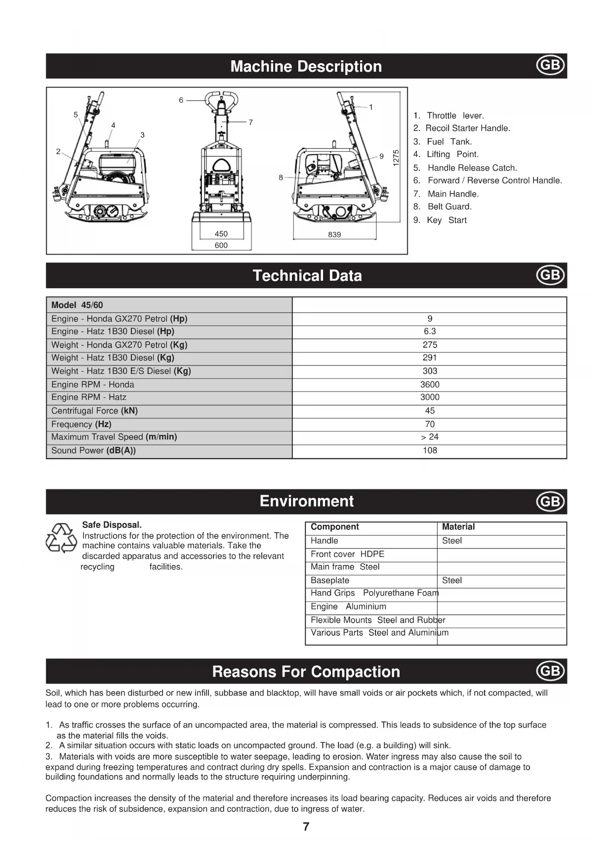DVWKHPDWHULDO¿OOVWKHYRLGV $VLPLODUVLWXDWLRQRFFXUVZLWKVWDWLFORDGVRQXQFRPSDFWHGJURXQG7KHORDGHJDEXLOGLQJZLOOVLQN 3. Materials with voids are more susceptible to water seepage, leading to erosion. Water ingress may also cause the soil to expand during freezing temperatures and contract during dry spells. Expansion and contraction is a major cause of damage to building foundations and normally leads to the structure requiring underpinning. Compaction increases the density of the material and therefore increases its load bearing capacity. Reduces air voids and therefore reduces the risk of subsidence, expansion and contraction, due to ingress of water. Model 45/60 Engine - Honda GX270 Petrol (kW) 6.7 Engine - Hatz 1B30 Diesel (kW) 4.7 Weight - Honda GX270 Petrol (lbs) 606 Weight - Hatz 1B30 Diesel (lbs) 641.5 Weight - Hatz 1B30 E/S Diesel (lbs) 668 Engine RPM - Honda 3600 Engine RPM - Hatz 3000 Centrifugal Force (kN) 45 Frequency (Hz) 70 Maximum Travel Speed (ft/min) > 78.7 Sound Power (dB(A)) 108 Component Material Handle Steel Front cover HDPE Main frame Steel Baseplate Steel Hand Grips Polyurethane Foam Engine Aluminium Flexible Mounts Steel and Rubber Various Parts Steel and Aluminium