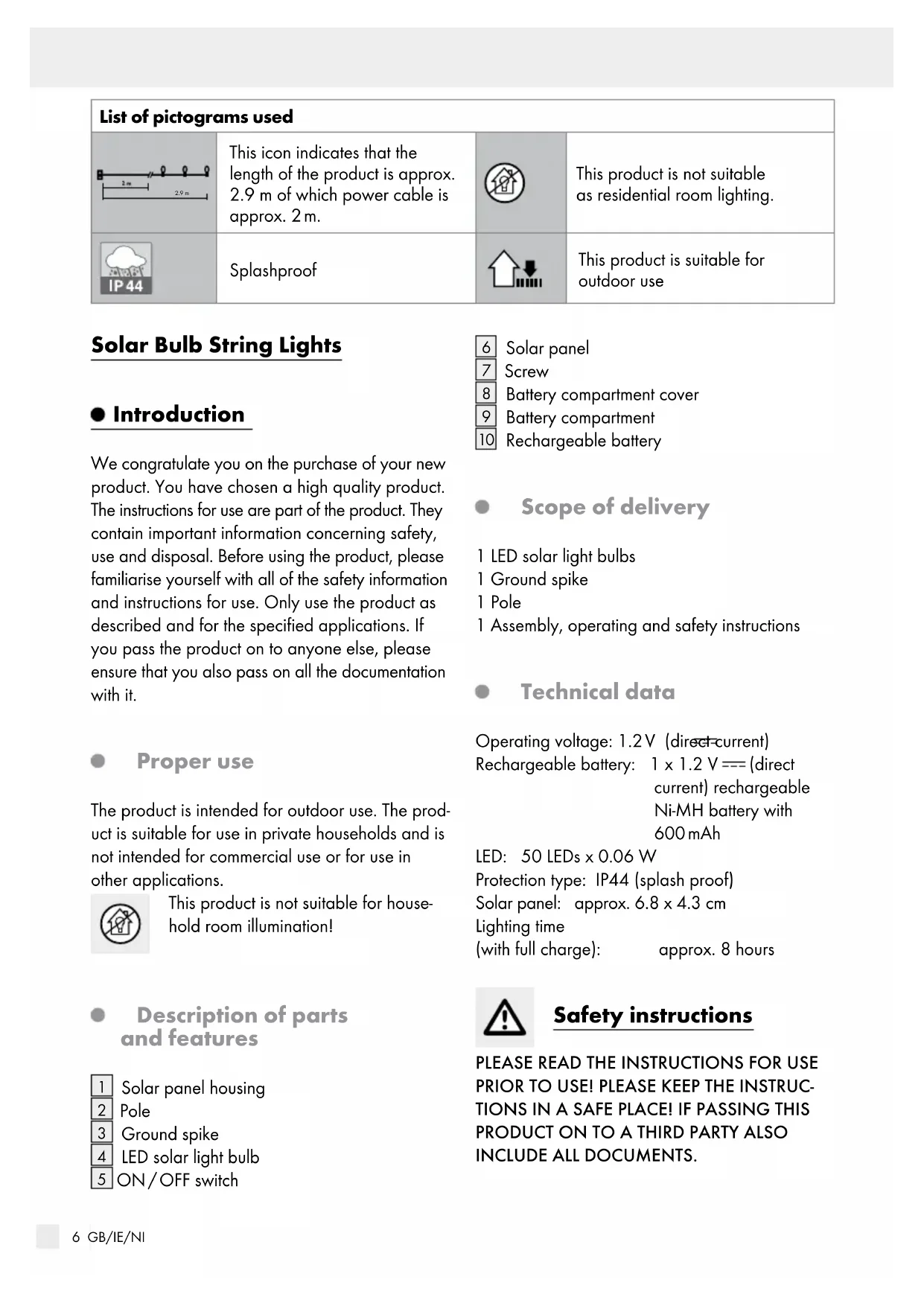 The product will automatically light on as it begins to get dark. The LEDs are a very long-life and energy-saving light source. The light duration depends on the amount of sunlight, the angle of light on the solar panel 6 and the temperature (the rechargeable battery capacity is temperature-dependent). A vertical angle of light at temperatures above the freezing point is ideal. The rechargeable battery does not achieve maximum capacity until after several charge and discharge cycles.