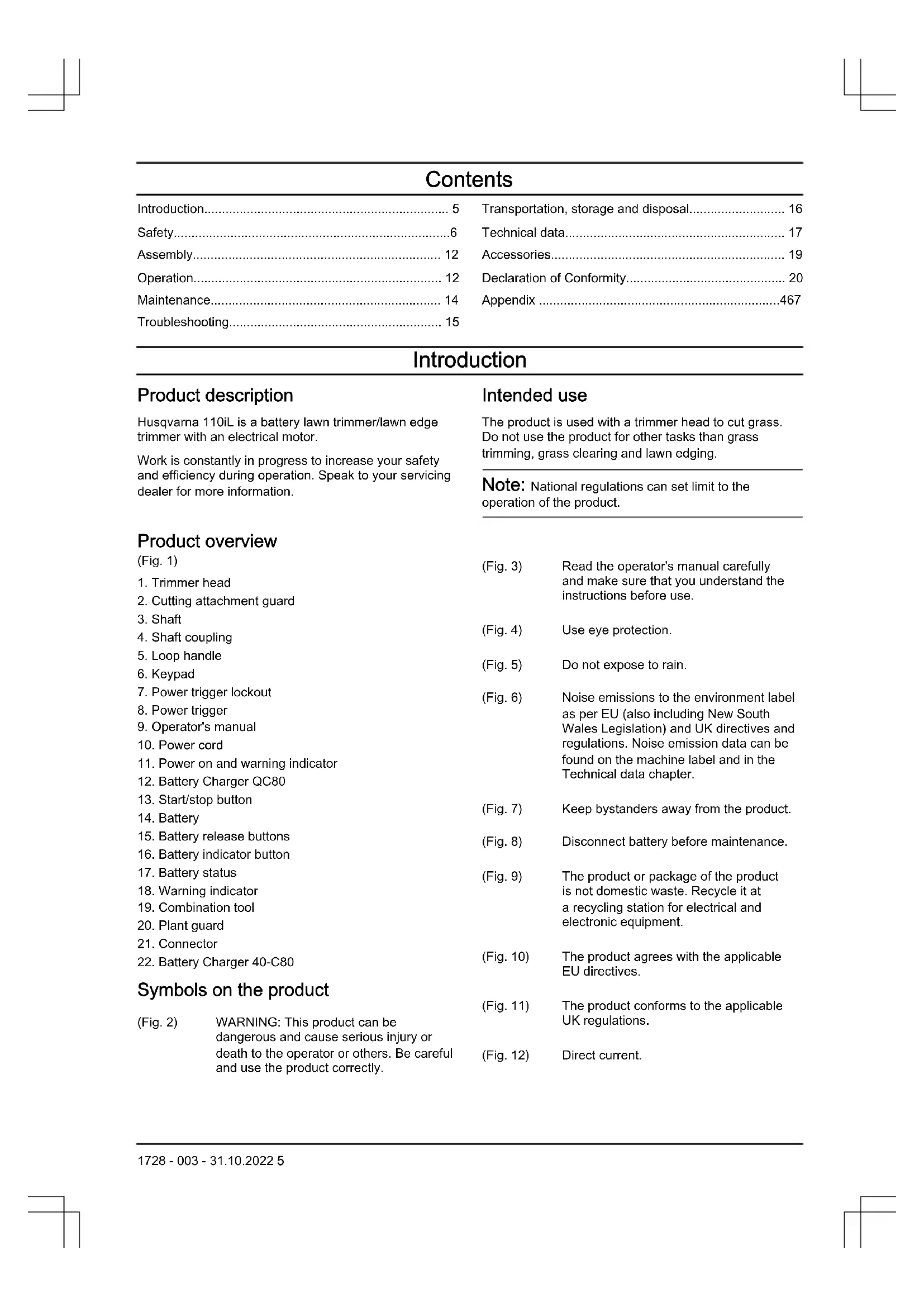 Huskvarna, 2022-07-05 Claes Losdal, R&D Manager, Husqvarna AB Responsible for technical documentation 20 1728 - 003 - 31.10.2022UK Declaration of conformity We, Husqvarna AB, SE-561 82 Huskvarna, Sweden, tel: +46-36-146500, declare on our sole responsibility that the product: Description Battery lawn trimmer / Lawn edge trimmer Brand Husqvarna Type / Model 110iL Identification Serial numbers dating from 2022 and onwards complies fully with the following UK regulations: Description The Supply of Machinery (Safety) Regulations 2008 Electromagnetic Compatibility Regulations 2016 The Noise Emission in the Environment by Equipment for use Outdoors Regulations 2001, Schedule 9 The Restriction of the Use of Certain Hazardous Substances in Electrical and Electronic Equipment Regulations
