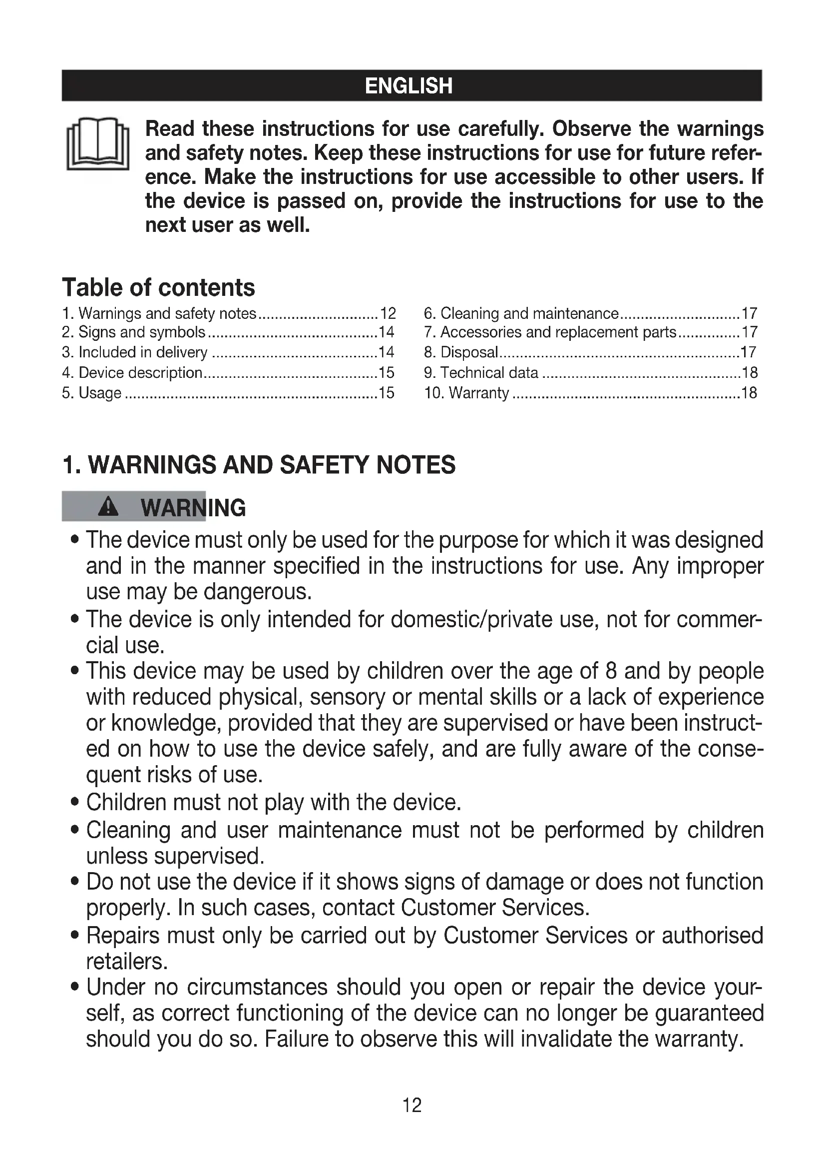 - The device is only intended for domestic/private use, not for commer
