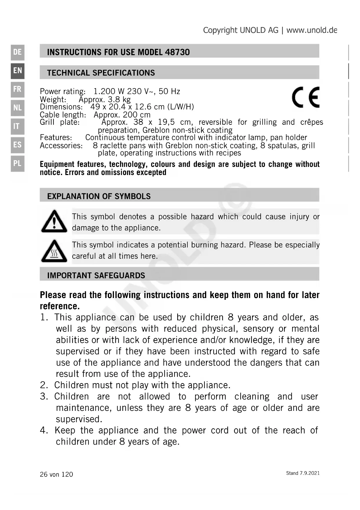 This symbol denotes a possible hazard which could cause injury or damage to the appliance. This symbol indicates a potential burning hazard. Please be especially careful at all times here. Copyright UNOLD AG | www.unold.de UNOLD ©Stand 7.9.2021 27 von 120