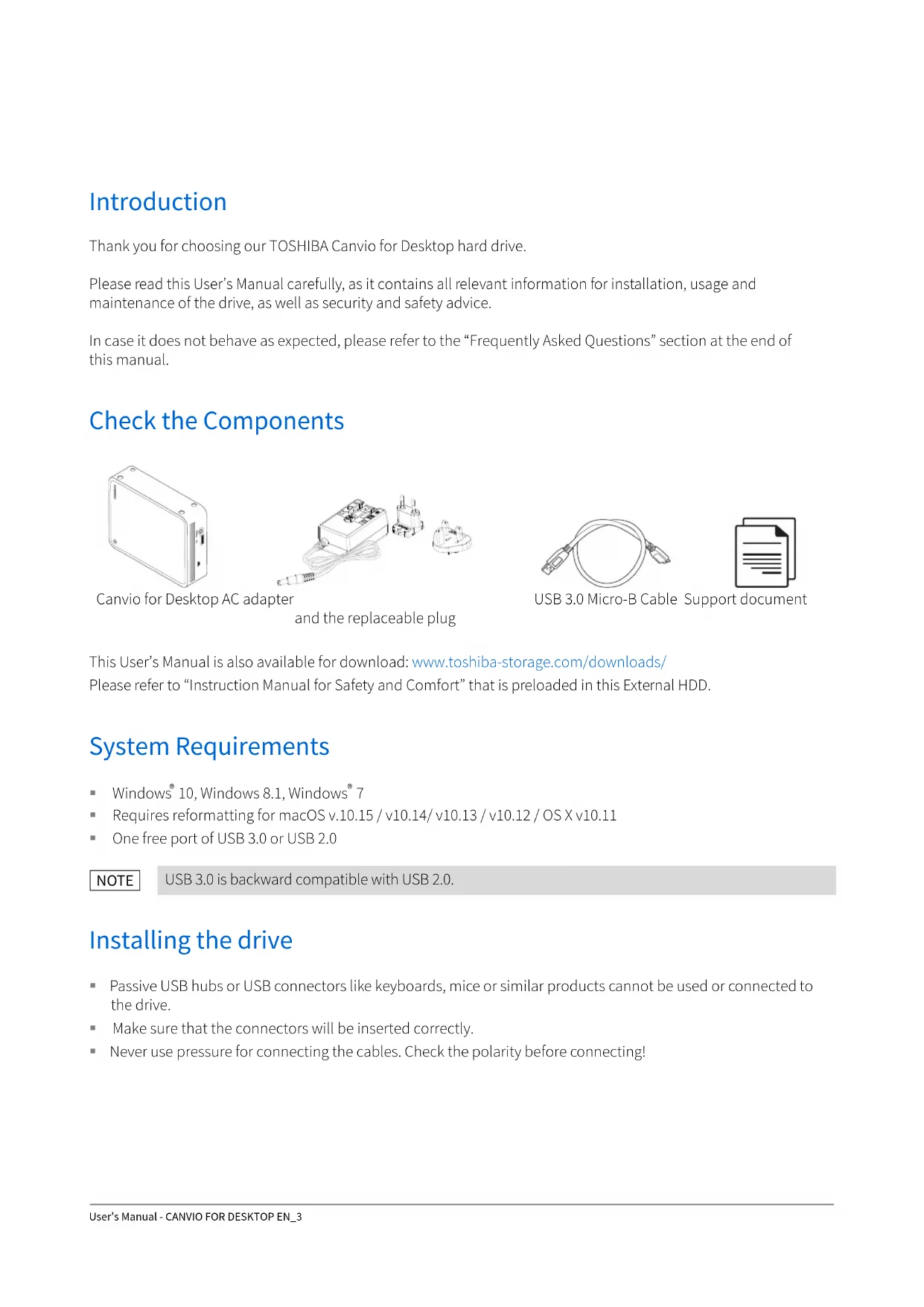Drag the hard disk icon to the trashcan. You can unplug the drive now. Cleaning the drive case / enclosure Before cleaning the drive, make sure that it’s physically disconnected from the computer. We suggest to use standard products for cleaning it and to make sure that possible remaining liquid on the surface will be wiped off.User’s Manual - CANVIO FOR DESKTOP EN_6 Further Advise For any further action of normal operation such as renaming the drive, backup data, or file management, we suggest to read your computer’s operation system user’s manual. Also for maintenance tasks such as defragmenting and optimisation we suggest to refer to the operating system user’s manual. We also strongly suggest having anti-virus software installed to protect your data against intended damage caused by virus or trojan programs. Frequently Asked Questions Q: Do I need USB drivers for Windows