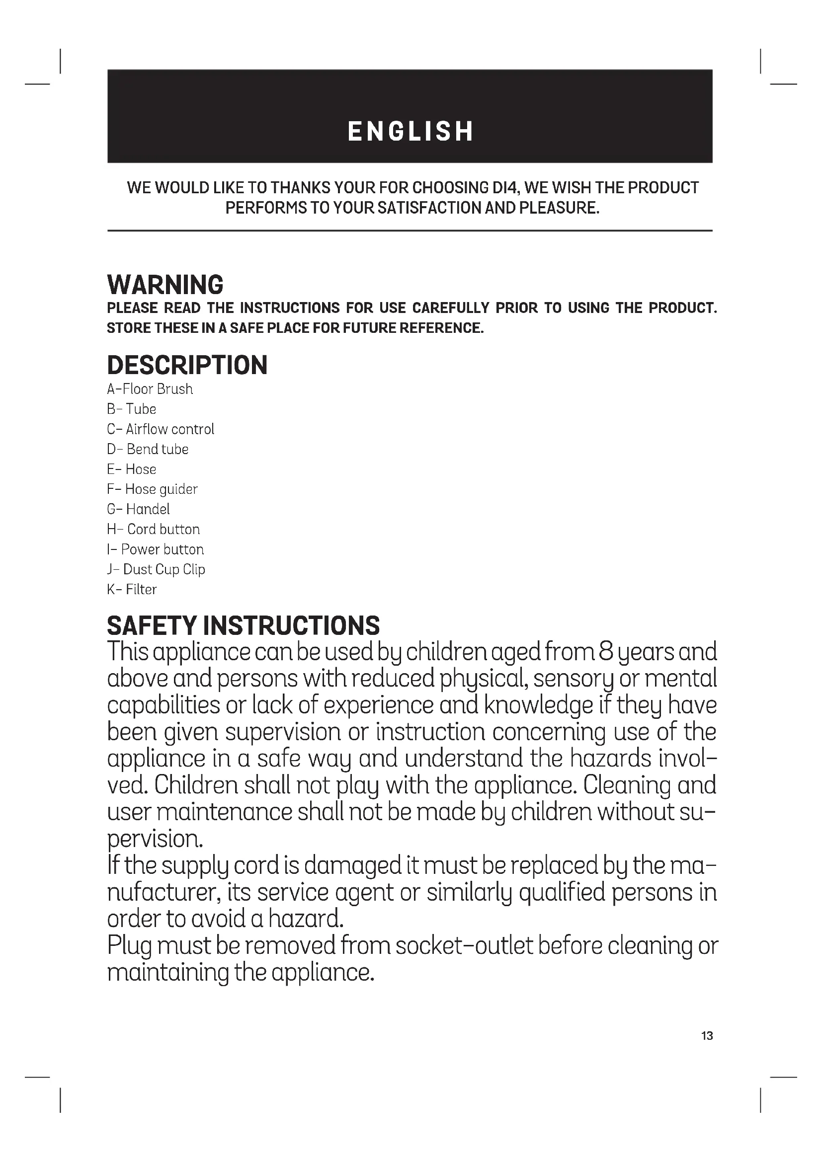 Este produto está em conformidade com a Diretiva Europeia 2012/19/EU quanto a dispo- sitivos elétricos e eletrónicos, conhecida como REEE (Resíduos de Equipamentos Elétricos e Eletrónicos), que disponibiliza o enquadramento legal dentro da União Europeia para a eliminação e reutilização de resíduos eletrónicos e elétricos. Não eliminar este produto no caixote do lixo. Dirigir-se antes ao centro de recolha de resíduos elétricos e eletrónicos da área de residência.13 WE WOULD LIKE TO THANKS YOUR FOR CHOOSING DI4, WE WISH THE PRODUCT PERFORMS TO YOUR SATISFACTION AND PLEASURE. WARNING PLEASE READ THE INSTRUCTIONS FOR USE CAREFULLY PRIOR TO USING THE PRODUCT. STORE THESE IN A SAFE PLACE FOR FUTURE REFERENCE. DESCRIPTION A-Floor Brush B- Tube C- Airflow control D- Bend tube E- Hose F- Hose guider G- Handel H- Cord button I- Power button J- Dust Cup Clip K- Filter SAFETY INSTRUCTIONS This appliance can be used by children aged from 8 years and above and persons with reduced physical, sensory or mental capabilities or lack of experience and knowledge if they have been given supervision or instruction concerning use of the appliance in a safe way and understand the hazards invol- ved. Children shall not play with the appliance. Cleaning and user maintenance shall not be made by children without su- pervision. If the supply cord is damaged it must be replaced by the ma- nufacturer, its service agent or similarly qualified persons in order to avoid a hazard. Plug must be removed from socket-outlet before cleaning or maintaining the appliance. ENGLISH14 IMPORTANT WARNINGS Prior to plugging in the product, check that your mains voltage is the same as the one indicated on the product label. The mains connection cable must not be tangled or wrapped around the product during use. Do not pull on the connection cord in order to unplug it. Do not use, connect or disconnect the device to the mains with your hands or feet wet. Proceed according to the conservation and cleaning section of this manual for cleaning. Unplug the product immediately from the mains in the event of any breakdown or damage and con- tact an authorised Technical support service. In order to prevent any risk of danger, do not open the device. Only qualified technical personnel from the brand´s Official Technical support service may carry out repairs or procedures on the device. Any incorrect use or improper handling of the product shall render the warranty null and void. Only an authorised technical support service centre may carry out repairs on this product. This appliance is designed exclusively for domestic use, in no case should be a commercial or indus- trial use. In case of misuse or tampering with the product, it will be out of warranty. Do not use the appliance to vacuum liquids (water, etc), sharp objects (pins, pins, nails, glass, etc), incandescent objects (matches, cigarettes) Never use the turbobrush to: Polish floors, suck (Liquids, wet or damp dust, hot ash, burning ob- jects, such as cigarettes, matches, sharp and hard items, such us: razors, pins, thumbtacks, pieces of glass, etc), flour, cement, plaster, printer or photocopier toner, etc. B&B TRENDS SL. disclaims all liability for damages that may occur to people, animals or objects, for the non-observance of these warnings.