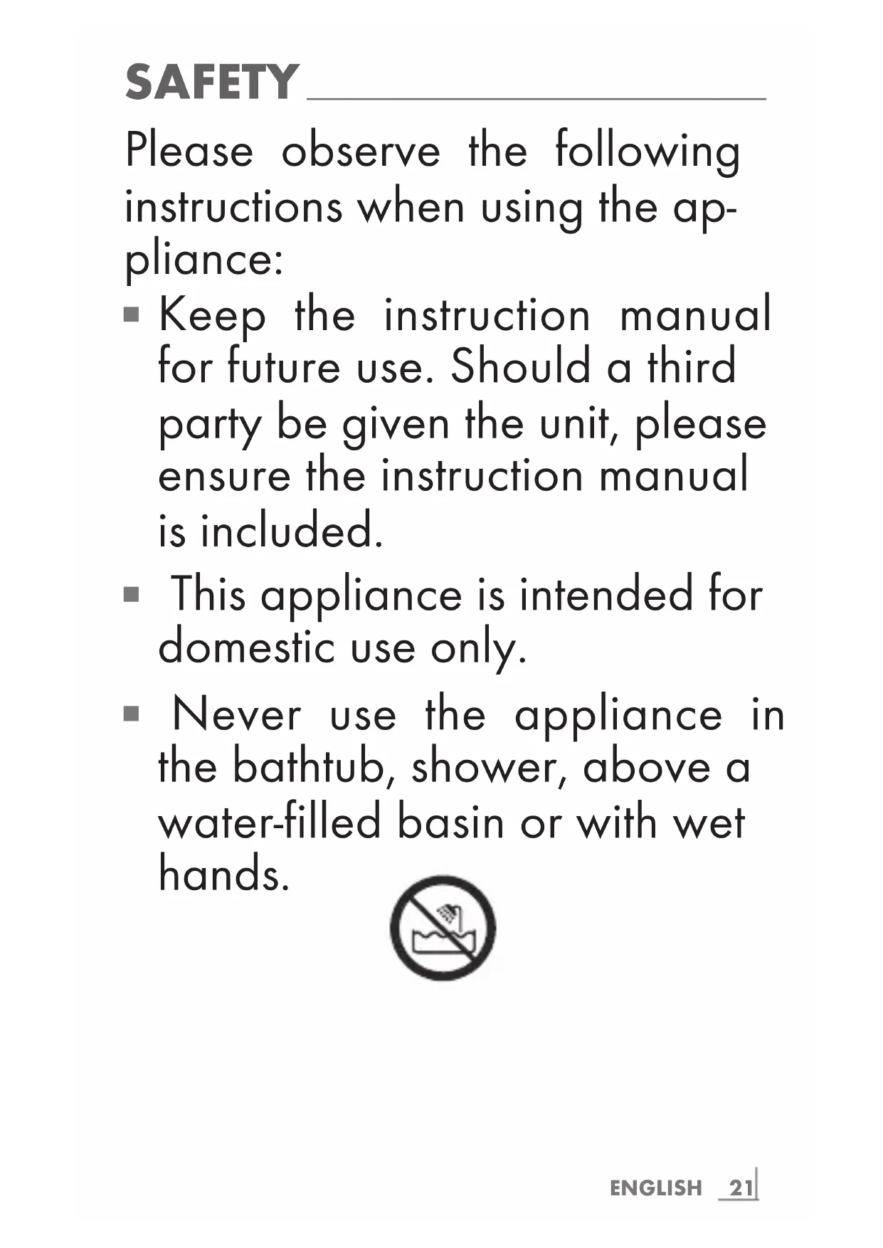 Never use the appliance in the bathtub, shower, above a water-filled basin or with wet hands.22 ENGLISH