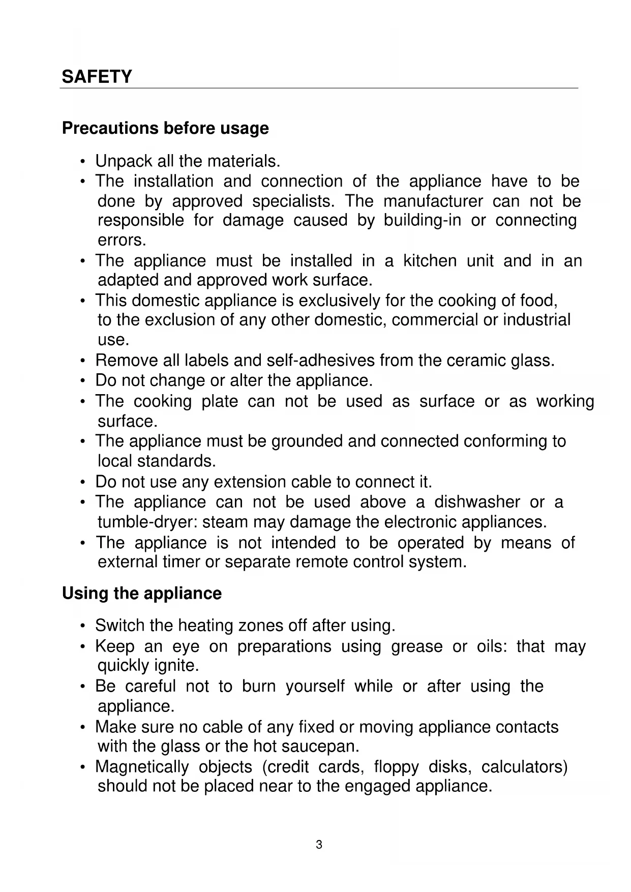 - Sugar, synthetic materials or aluminium sheets must not contact with the heating zones. These may cause breaks or other alterations of the vitroceramic glass by cooling: switch on the appliance and take them immediately out of the hot heating zone (be careful: do not burn yourself).