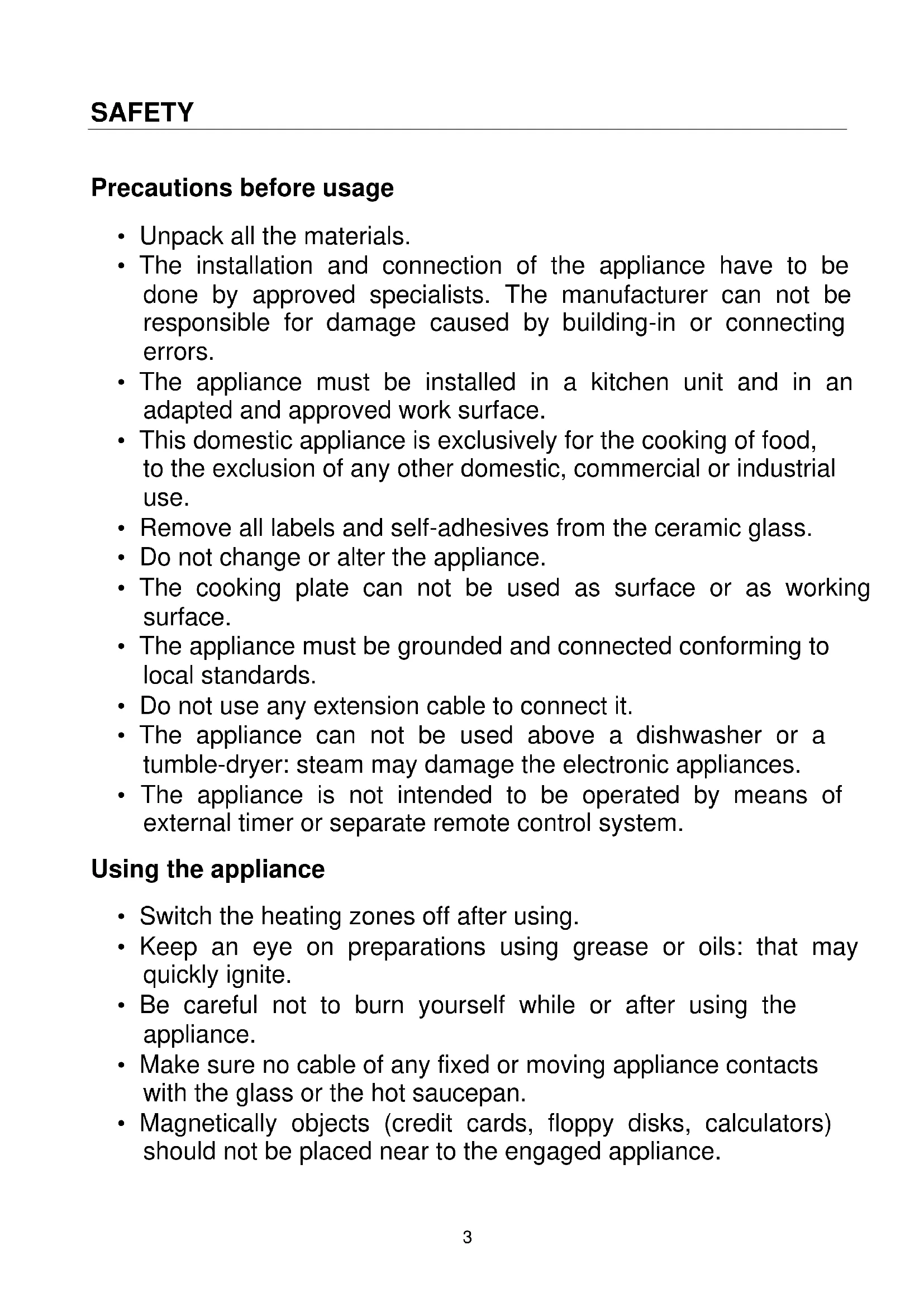 - Sugar, synthetic materials or aluminium sheets must not contact with the heating zones. These may cause breaks or other alterations of the vitroceramic glass by cooling: switch on the appliance and take them immediately out of the hot heating zone (be careful: do not burn yourself).