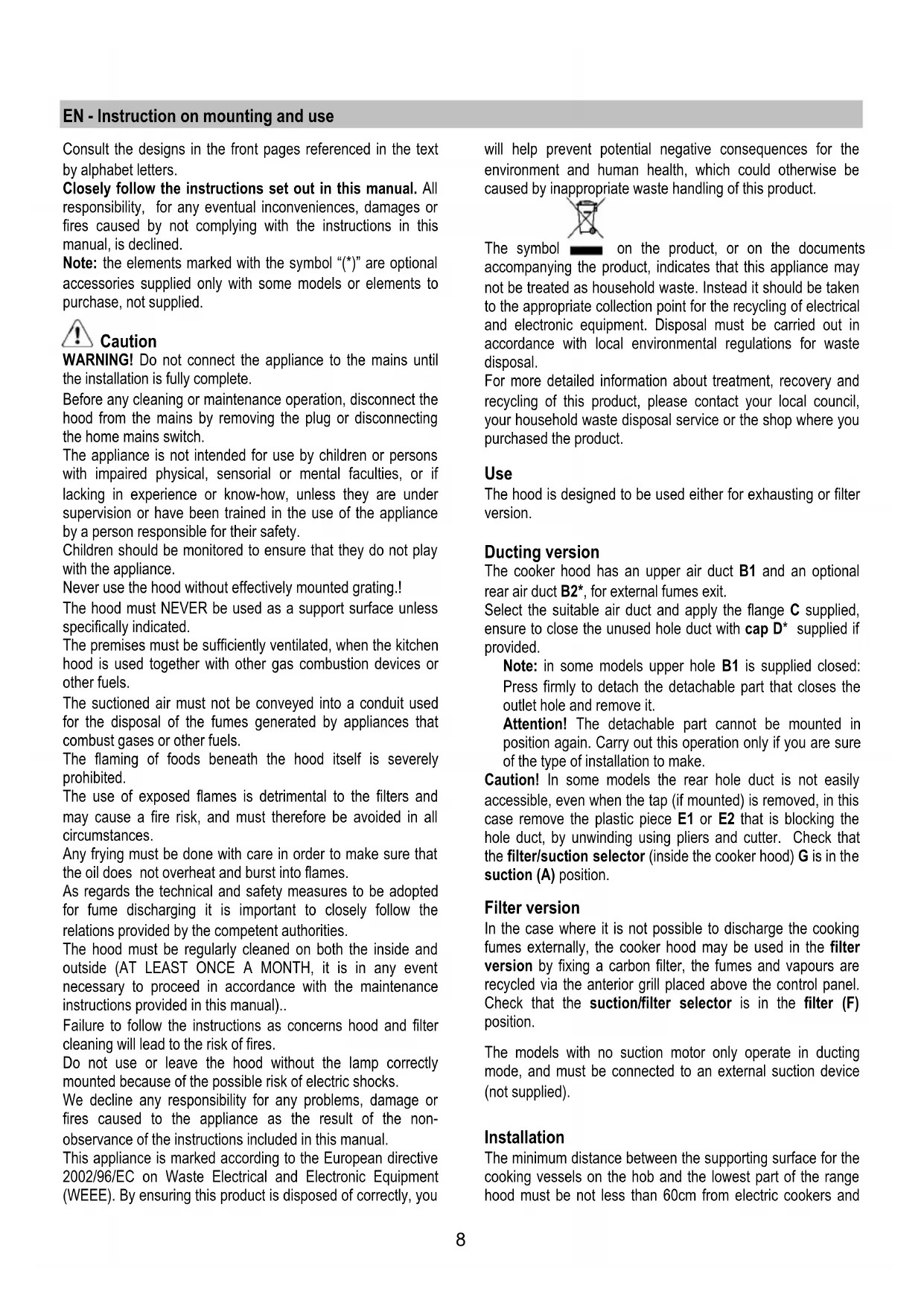 supply and checking the efficient function, always check that the mains cable is correctly assembled. Mounting The cooker hood may be installed on the wall or on the base of a cabinet; if supplied, use the hole gauge H to drill the correct distance, otherwise lean the cooker hood on the wall or on the base of the cabinet and mark the holes with a pencil. Wall mounting - Insert the wall screw anchors J in the drilled holes and the two K screws in the upper drill holes, remove the grill and hook the cooker hood to the 2 screws, finally from the inside, insert the third screw L and lock them all in. Cabinet fixing - Affix the cooker hood with the 4 M screws from inside the cabinet. Operation The hood is fitted with a control panel with aspiration speed selection control and a light switch to control cooking area lights. Use the high suction speed in cases of concentrated kitchen vapours. It is recommended that the cooker hood suction is switched on for 5 minutes prior to cooking and to leave in operation during cooking and for another 15 minutes approximately after terminating cooking. Always open the vapour catcher N*. If your product is provided with an electrically or mechanically activated valve, the keys and/or the buttons and/or the handles available are for controlling the lights and for opening and closing the valve. Maintenance ATTENTION! Before performing any maintenance operation, isolate the hood from the electrical supply by switching off at the connector and removing the connector fuse. Or if the appliance has been connected through a plug and socket, then the plug must be removed from the socket. Cleaning The cooker hood should be cleaned regularly (at least with the same frequency with which you carry out maintenance of the fat filters) internally and externally. Clean using the cloth dampened with neutral liquid detergent. Do not use abrasive products. DO NOT USE ALCOHOL!