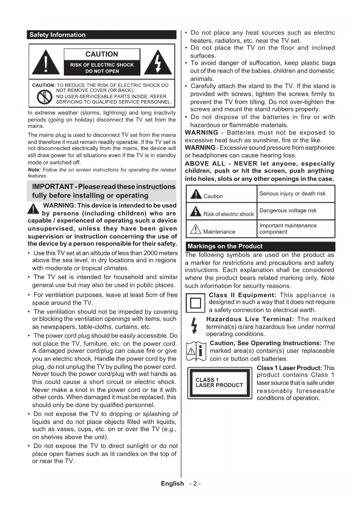 Caution, See Operating Instructions: The marked area(s) contain(s) user replaceable coin or button cell batteries. CLASS 1 LASER PRODUCT Class 1 Laser Product: This product contains Class 1 laser source that is safe under reasonably foreseeable conditions of operation.English - 3 - WARNING Do not ingest the battery, Chemical Burn Hazard This product or the accessories supplied with the product may contain a coin/button cell battery. If the coin/button cell battery is swallowed, it can cause severe internal burns in just 2 hours and can lead to death. Keep new and used batteries away from children. If the battery compartment does not close securely, stop using the product and keep it away from children. If you think batteries might have been swallowed or placed inside any part of the body, seek immediate medical attention. – – – – – – – – – – – – Warning Stability Hazard A television may fall, causing serious personal injury or death. Many injuries, particuIarly to children, can be avoided by taking simple precautions such as: