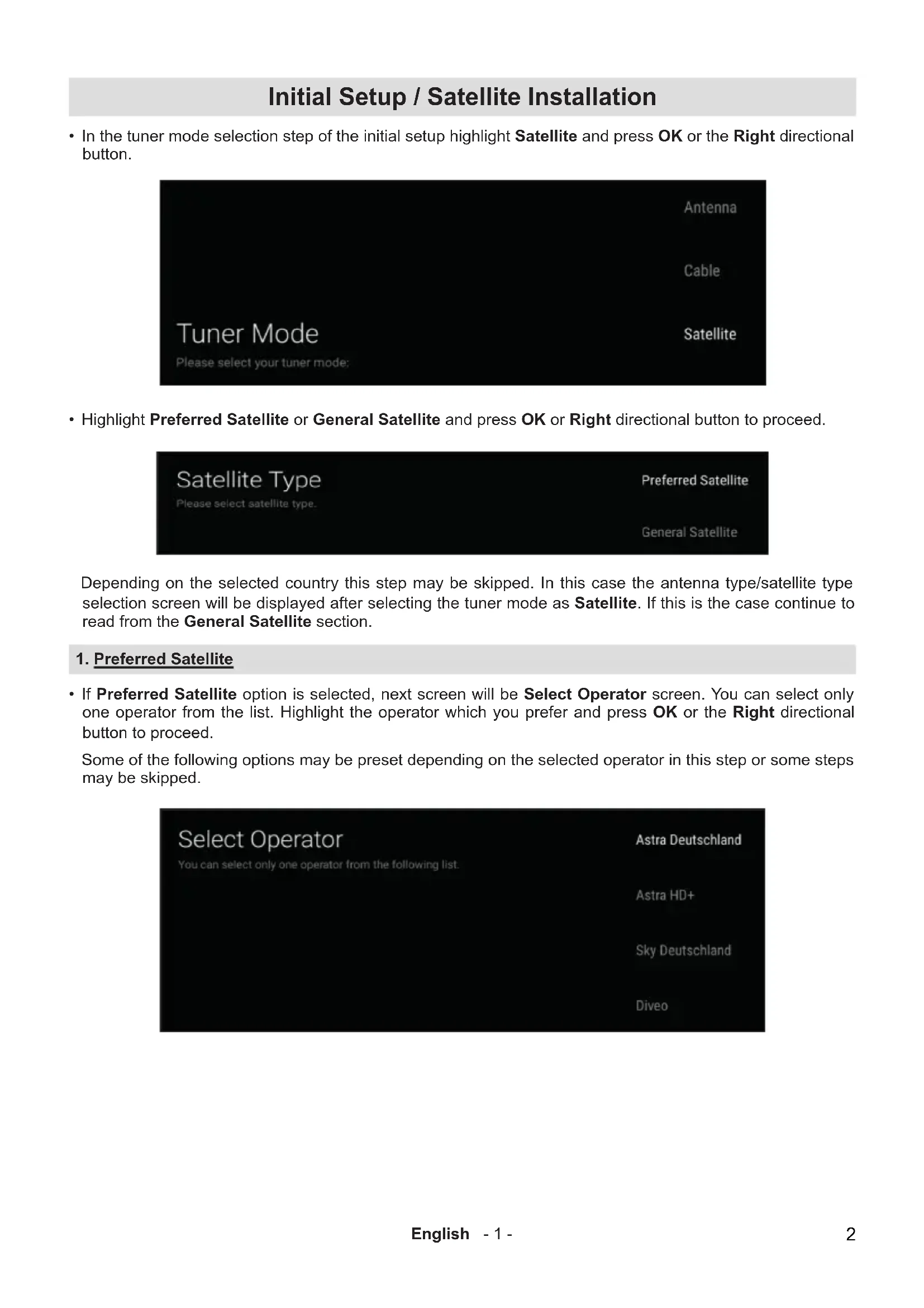 - If Preferred Satellite option is selected, next screen will be Select Operator screen. You can select only one operator from the list. Highlight the operator which you prefer and press OK or the Right directional button to proceed. Some of the following options may be preset depending on the selected operator in this step or some steps may be skipped. 2English - 2 - 1.1. Antenna Type - Direct