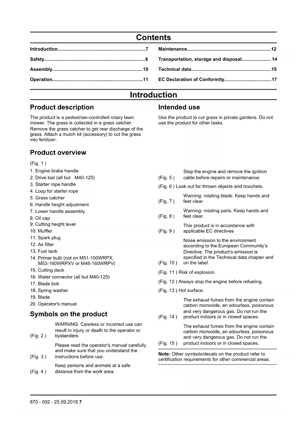 - EC Declaration of Conformity Introduction Product description The product is a pedestrian-controlled rotary lawn mower. The grass is collected in a grass catcher. Remove the grass catcher to get rear discharge of the grass. Attach a mulch kit (accessory) to cut the grass into fertilizer. Intended use Use the product to cut grass in private gardens. Do not use the product for other tasks. Product overview (Fig. 1 ) p. 17