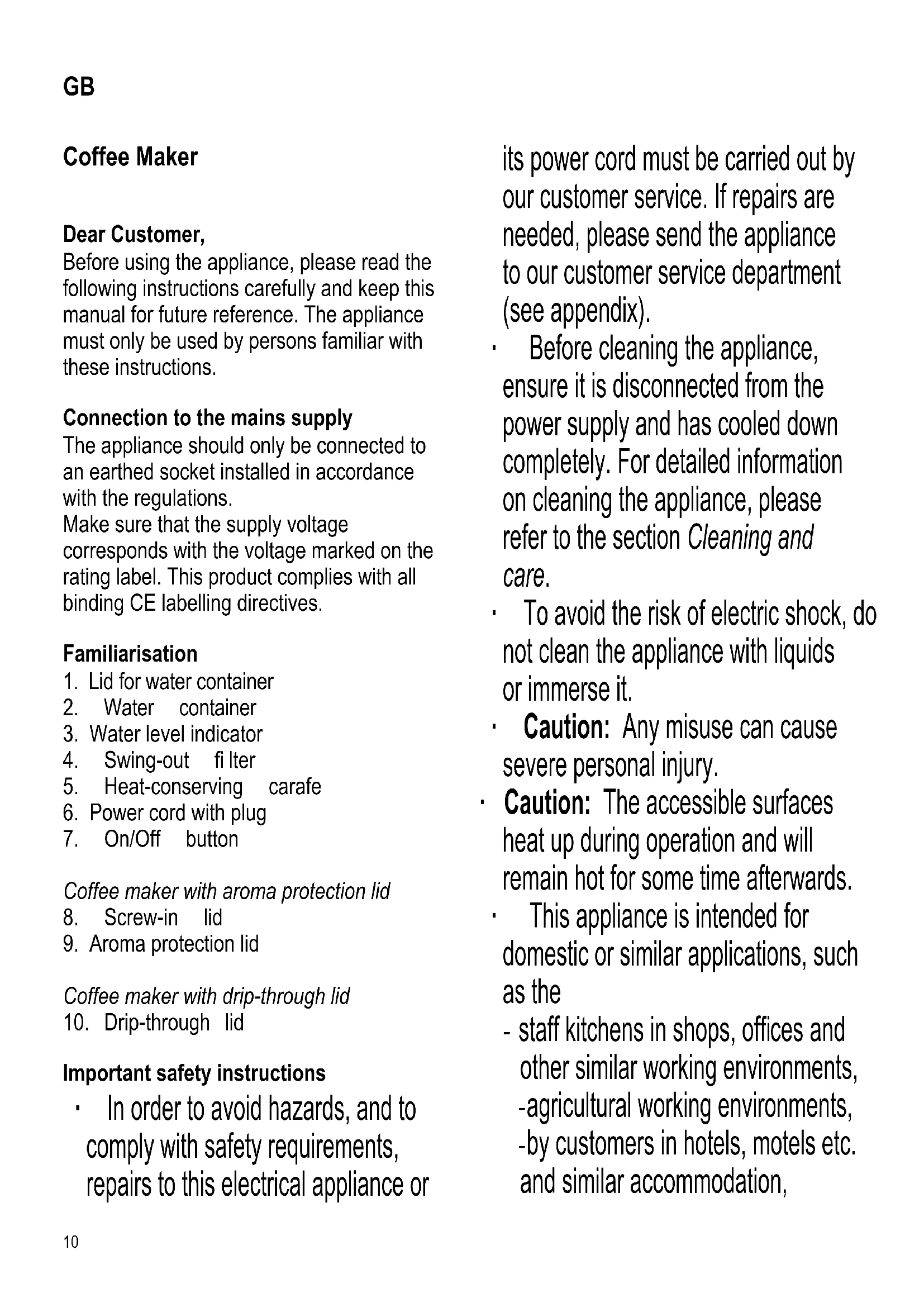 Important safety instructions ∙ In order to avoid hazards, and to comply with safety requirements, repairs to this electrical appliance or its power cord must be carried out by our customer service. If repairs are needed, please send the appliance to our customer service department (see appendix). ∙ Before cleaning the appliance, ensure it is disconnected from the power supply and has cooled down completely. For detailed information on cleaning the appliance, please refer to the section Cleaning and care. ∙ To avoid the risk of electric shock, do not clean the appliance with liquids or immerse it. ∙ Caution: Any misuse can cause severe personal injury. ∙ Caution: The accessible surfaces heat up during operation and will remain hot for some time afterwards. ∙ This appliance is intended for domestic or similar applications, such as the - staff kitchens in shops, offi ces and other similar working environments, - agricultural working environments, - by customers in hotels, motels etc. and similar accommodation, GB11 - in bed-and breakfast type environments. ∙ This appliance may be used by children (at least 8 years of age) and by persons with reduced physical, sensory or mental capabilities, or lacking experience and knowledge, provided they have been given supervision or instruction concerning the use of the appliance and fully understand all dangers and safety precautions involved. ∙ Children must not be permitted to play with the appliance. ∙ Children must not be permitted to carry out any cleaning or maintenance work on the appliance unless they are supervised and at least 8 years of age. ∙ The appliance and its power cord must be kept well away from children under 8 at all times. ∙ Caution: Keep any packaging materials well away from children – these are a potential source of danger, e.g. of suffocation. ∙ Every time the appliance is used, the main body including the power cord as well as any attachment fi tted should be checked thoroughly for any defects. Should the appliance, for instance, have been dropped onto a hard surface, or if excessive force has been used to pull the power cord, it must no longer be used: even invisible damage may have adverse effects on the operational safety of the appliance. ∙ During operation, the coffee maker must be placed on a level, non-slip surface, impervious to splashes and stains. ∙ Do not allow the appliance or its power cord to touch hot surfaces or to come into contact with any heat sources. ∙ To prevent the danger of hot water or steam being emitted, always switch off the coffee maker and allow suffi cient time for the appliance to cool down before it is opened or any accessories or attachments are removed. ∙ Children should be supervised to ensure that they do not play with the appliance. ∙ Remove the plug from the wall socket - in case of any malfunction, - during cleaning, - if the appliance is not being used for an extended period of time. ∙ When removing the plug from the wall socket, never pull on the power cord; always grip the plug itself. ∙ Do not allow the power cord to hang free; the cord must be kept well away from hot parts of the appliance. ∙ No responsibility will be accepted if damage results from improper use, or if these instructions are not complied with. Automatic switch-off To save energy, the appliance will switch itself off automatically after the brewing cycle is complete. Before using for the fi rst time Before making coffee for the fi rst time,12 let the appliance go through two or three fi ltration cycles using the indicated maximum amount of cold water, but without using ground coffee. This should also be done if the appliance has not been used for an extended period of time, and after descaling. General information ∙ A measuring scale on the water container facilitates fi lling the container with the correct amount of clean water. With a dual-scale, the left scale is used for regular-sized cups of approx.125ml, while the right scale is used for smaller cups. Make sure that the indicated maximum amount of water is not exceeded. ∙ Caution: the hot water outlet is integrated in the water container lid. Do not attempt to open the lid while brewing is in progress: there is a danger of scalding. ∙ If several consecutive brewing cycles are required, allow the appliance to cool down for 5 minutes or so after each cycle. ∙ Important note: When fi lling the appliance with fresh water shortly after a brewing cycle is completed, there is a danger of scalding from hot water or steam escaping through the water outlet. Making coffee ∙ Filling with water: Open the water container lid and fi ll the container with the required quantity of water. ∙ Inserting the paper fi lter: Open the swing-out fi lter and insert a size-4 paper fi lter, fi rst folding down the perforated sides of the fi lter. ∙ Filling with ground coffee: For each regular-sized cup (125ml), a measure of about 6 g (= 1½ - 2 teaspoons) of medium or fi nely ground coffee will be required. Close the water container lid afterwards. ∙ Preparing the glass carafe: Fit the aroma protection lid or the drip- through lid onto the carafe, and then place the carafe into the appliance. If correctly inserted, the lid will disable the drip-stop mechanism in the swing-out fi lter during the brewing cycle. ∙ Starting the brewing cycle: Put the plug into a suitable wall outlet and use the On/Off button to turn the coffee maker on. The fi ltration cycle starts and the water passes through the fi lter. ∙ Removing the glass carafe: Wait until all the water has passed through the fi lter before the carafe is removed from the appliance. To keep the coffee hot for as long as possible, remove the aroma protection lid and use the screw-in lid to close the carafe. However, this is not necessary if your coffee maker has a drip- through lid, which can remain on the carafe. Once the brewing cycle is complete, the appliance switches off