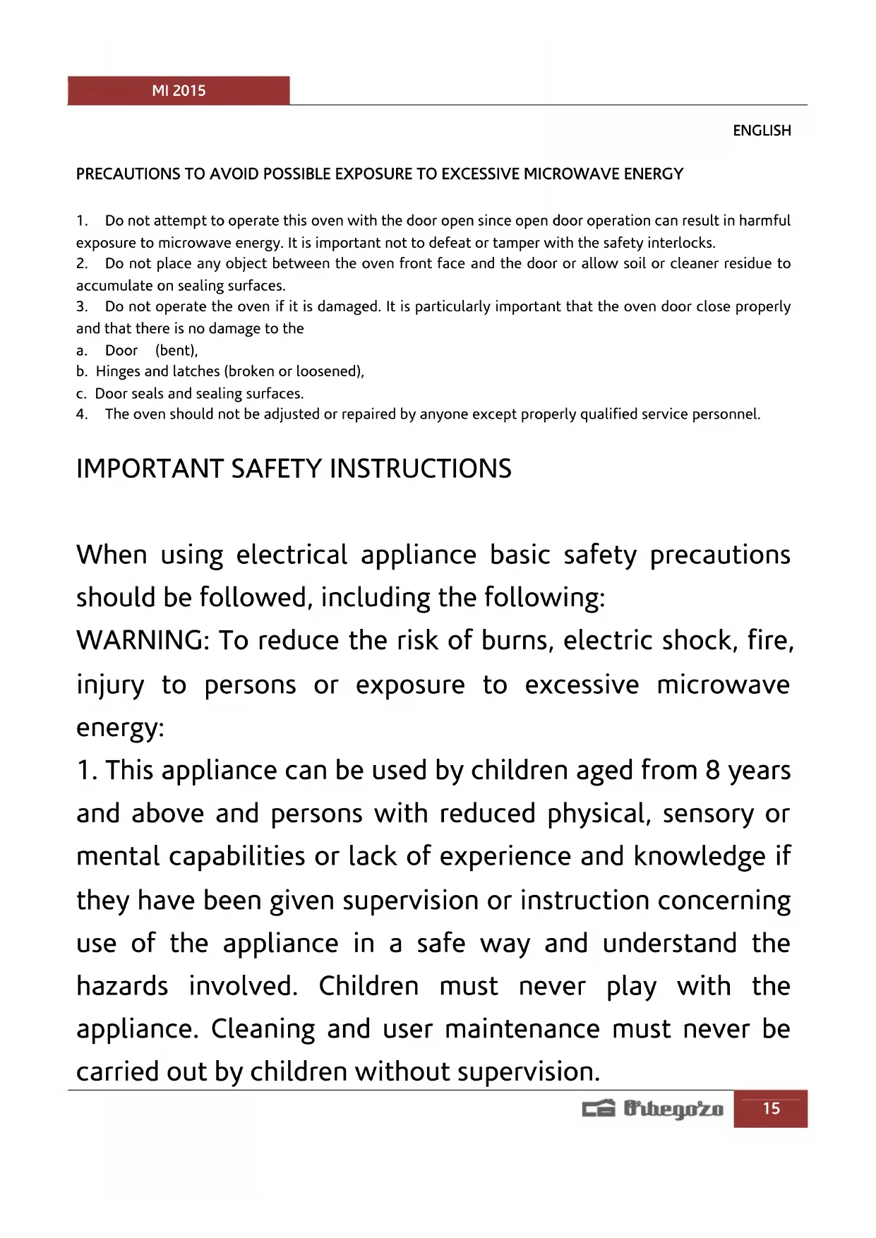 Download the instructions for your Microwave Oven in PDF format for free! Find your manual MI 2015 - Orbegozo and take your electronic device back in hand. On this page are published all the documents necessary for the use of your device. MI 2015 by Orbegozo.