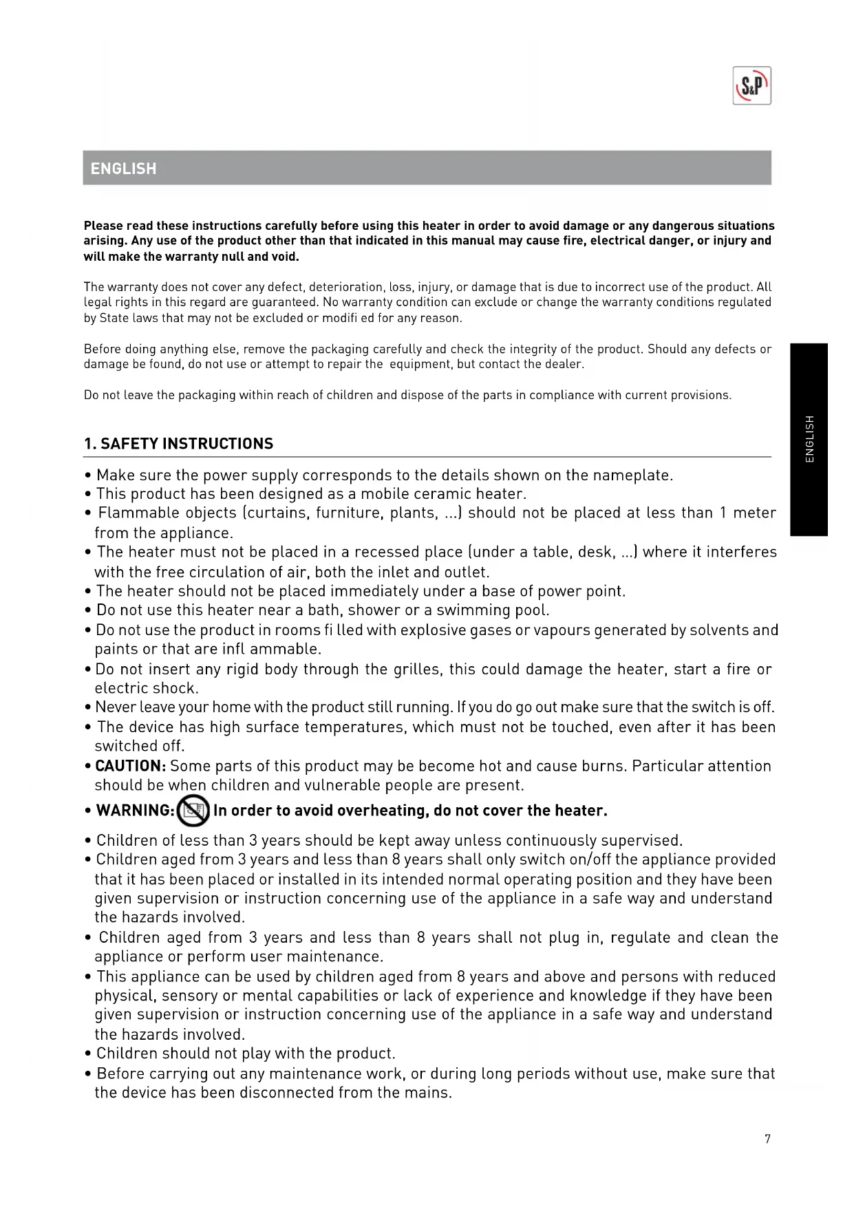 - Para aclarar cualquier duda con respecto a los productos S&P diríjase a la Red de Servicios Post Venta si es en territorio español, o a su distribuidor habitual en el resto del mundo. Para su localización puede consultar la página WEB www. solerpalau.com EL FABRICANTE NO SE HACE RESPONSABLE DE LOS DAÑOS PRODUCIDOS A PERSONAS Y/O COSAS DEBIDOS AL IN- CUMPLIMIENTO DE ESTAS ADVERTENCIAS. S&P SE RESERVA EL DERECHO A MODIFICACIONES DEL PRODUCTO SIN PREVIO AVISO.7 ENGLISH ENGLISH Please read these instructions carefully before using this heater in order to avoid damage or any dangerous situations arising. Any use of the product other than that indicated in this manual may cause fi re, electrical danger, or injury and will make the warranty null and void. The warranty does not cover any defect, deterioration, loss, injury, or damage that is due to incorrect use of the product. All legal rights in this regard are guaranteed. No warranty condition can exclude or change the warranty conditions regulated by State laws that may not be excluded or modifi ed for any reason. Before doing anything else, remove the packaging carefully and check the integrity of the product. Should any defects or damage be found, do not use or attempt to repair the equipment, but contact the dealer. Do not leave the packaging within reach of children and dispose of the parts in compliance with current provisions.