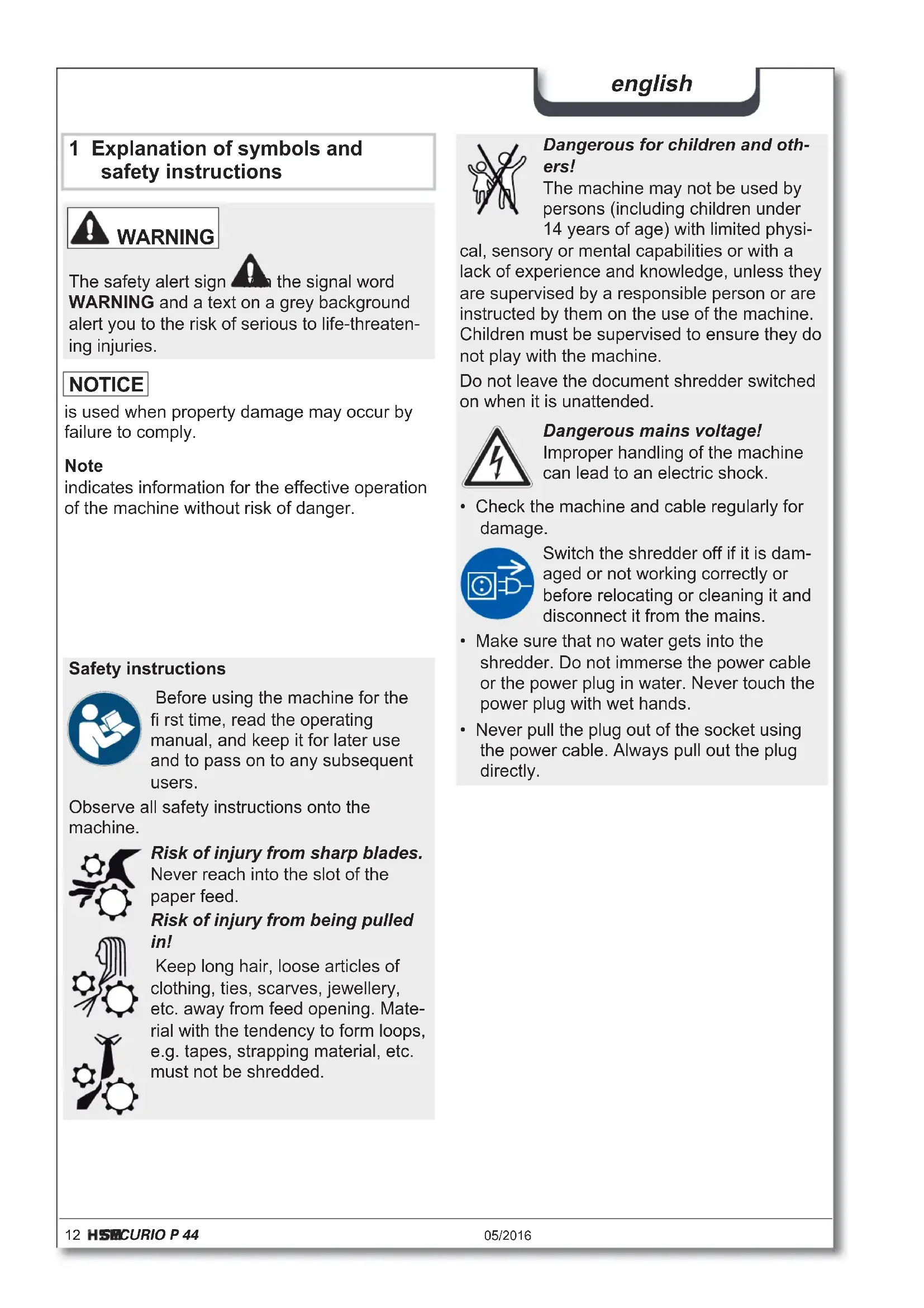 - Let the cutting unit run in the permanent mode for about 10 seconds without any paper. Paper dust and particles are shaken off. WARNING Dangerous mains voltage! Improper handling of the machine can lead to an electric shock. Switch the shredder off before relocating or cleaning it and disconnect the mains plug. Service work which requires the housing covers to be removed may only be carried out by HSM Cus- tomer Service and service techni- cians of our contractual partners. See page 202 for our customer service addresses. PAPERcontrol The measuring of the paper thickness is regu- larly calibrated: the LED fl ashes for a short time after 400 seconds.20 SECURIO P 44 05/2016 english This document shredder meets the applicable harmonisation legislation of the European Union:
