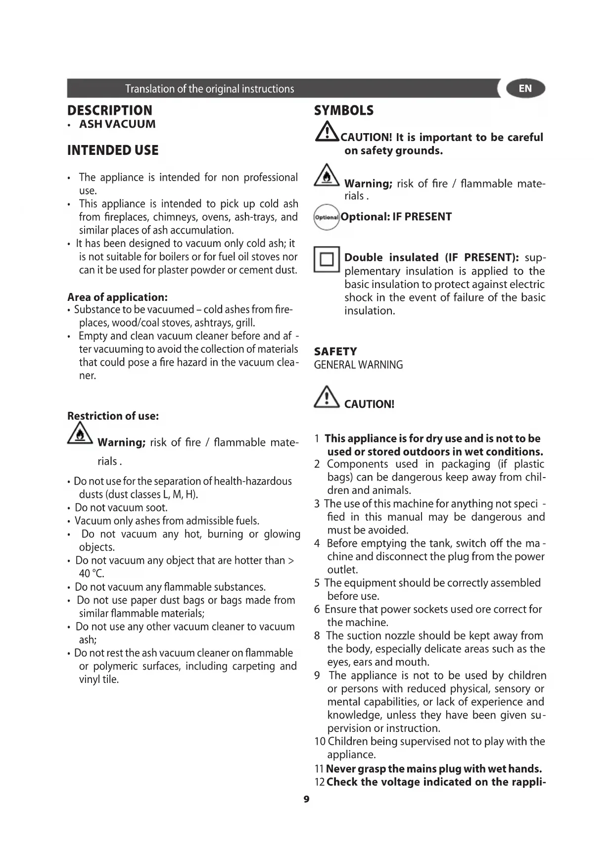 CAUTION! It is important to be careful on safety grounds. Warning; risk of fire / flammable mate- rials . Optional: IF PRESENT Double insulated (IF PRESENT): sup- plementary insulation is applied to the basic insulation to protect against electric shock in the event of failure of the basic insulation. SAFETY GENERAL WARNING CAUTION! 1 This appliance is for dry use and is not to be used or stored outdoors in wet conditions. 2 Components used in packaging (if plastic bags) can be dangerous keep away from chil