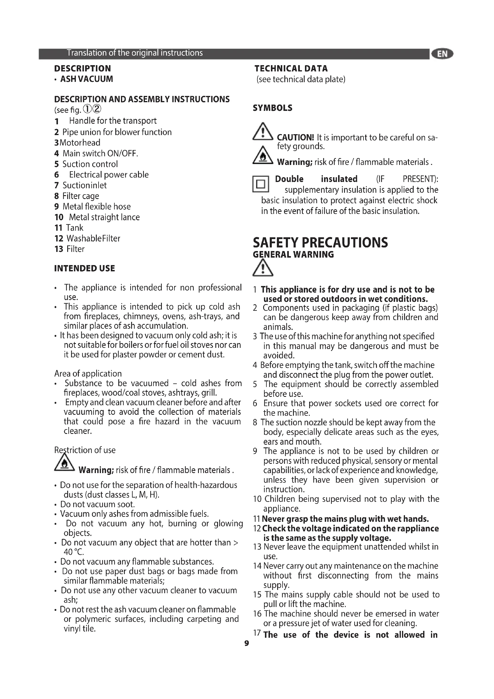- Empty and clean vacuum cleaner before and after vacuuming to avoid the collection of materials that could pose a re hazard in the vacuum cleaner. Restriction of use Warning; risk of re / ammable materials .