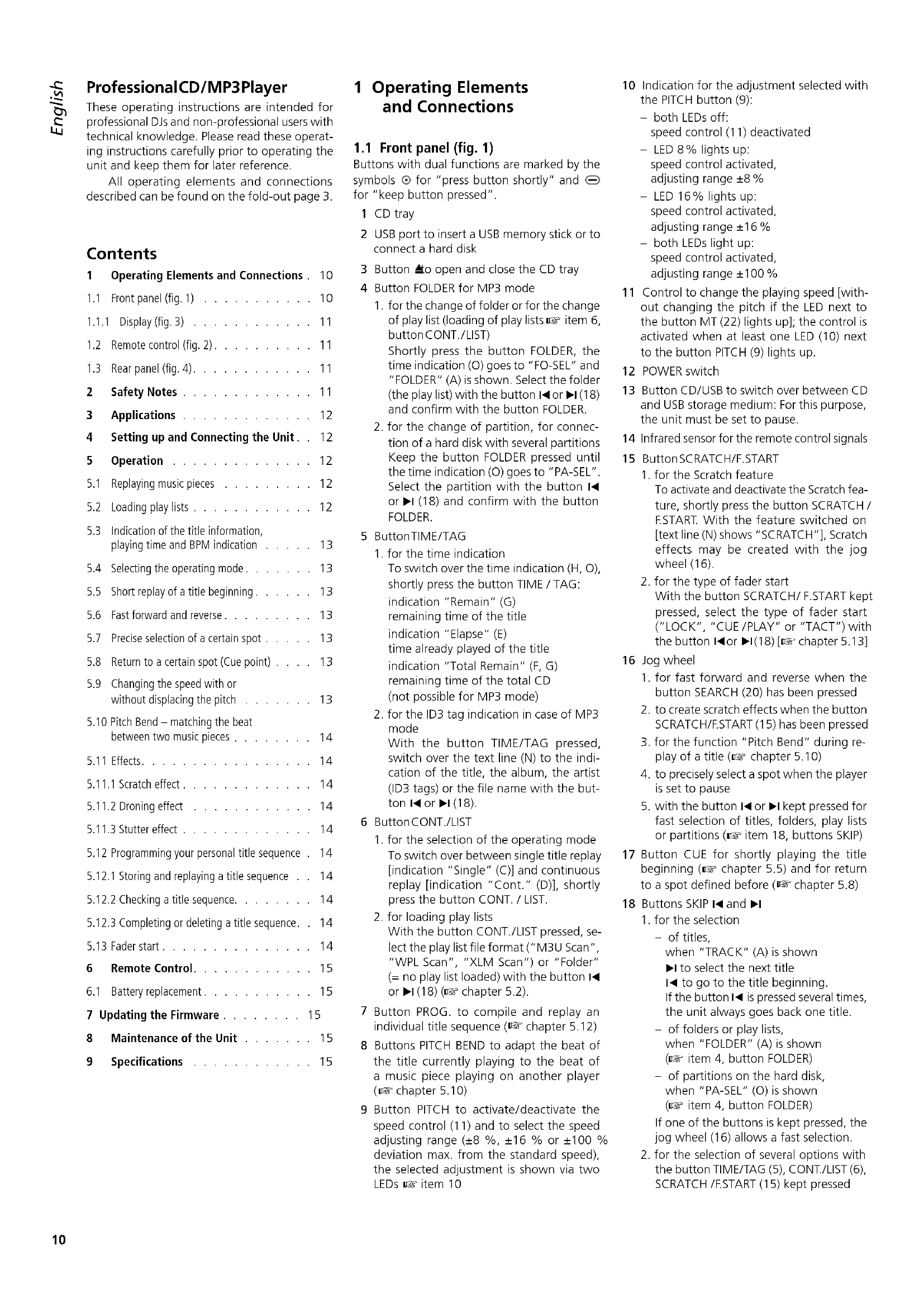 chapter 5.8] by a short control pulse of the mixer. When the fader is closed, the player will return to this starting point by another control pulse and will be set to pause there.1. × Cue Play2. × PauseREMOTEFig. 7 Fader start via control pulse15 English 6 Remote Control The infrared remote control provided is supplied with a battery inserted. Prior to the first opera- tion, remove the insulating foil from the battery support on the rear side of the remote control. When pressing a button, always direct the remote control towards the infrared sensor (14) on the unit. There must be no obstacles between remote control and sensor. The following buttons of the remote control can be used like the buttons on the unit: OPEN / CLOSE (23) [corresponds to button (3)] FOLDER (25) PITCH BEND (26) MT (27) PITCH (28) PLAY / PAUSE (29) CUE (30) PROG. (31) CD / USB (32) The buttons SINGLE / CONT (33), TIME (34) and SKIP ❙◀ / ▶❙ (35) can be used with limitations like the buttons on the unit CONT. / LIST (6), TIME / TAG (5) and SKIP ❙◀ / ▶❙ (18): – The button SINGLE / CONT can only be used for switching over the operating mode; it is not possible to load play lists. – The button TIME can only be used for swit- ching over the time indication; it is not possible to switch over the ID3 tag indication. – The SKIP buttons ❙◀ / ▶❙ of the remote control can be used like the buttons on the unit for selection of titles, folders, play lists and par- titions; for fast selection keep the respective button pressed. However, the buttons cannot be used in com- bination with other buttons. The numerical keys (24) and the SCAN buttons ◀◀ and ▶▶ (36) can be used as an alternative to the buttons on the unit: – The numerical keys can be used instead of the SKIP buttons to select titles, folders, play lists and partitions. The selection is made by the input of the corresponding number. In case of numbers of several digits, press the corre- sponding numerical keys one after the other, e. g. the buttons “1” and “0” for number 10. – The SCAN buttons ◀◀ and ▶▶ serve for fast forward and reverse: As long as the respective SCAN button is kept pressed, the title is played forward or backward. If the remote control is not used for a longer period of time, remove the battery so that the remote control will not be damaged if the bat- tery should leak.
