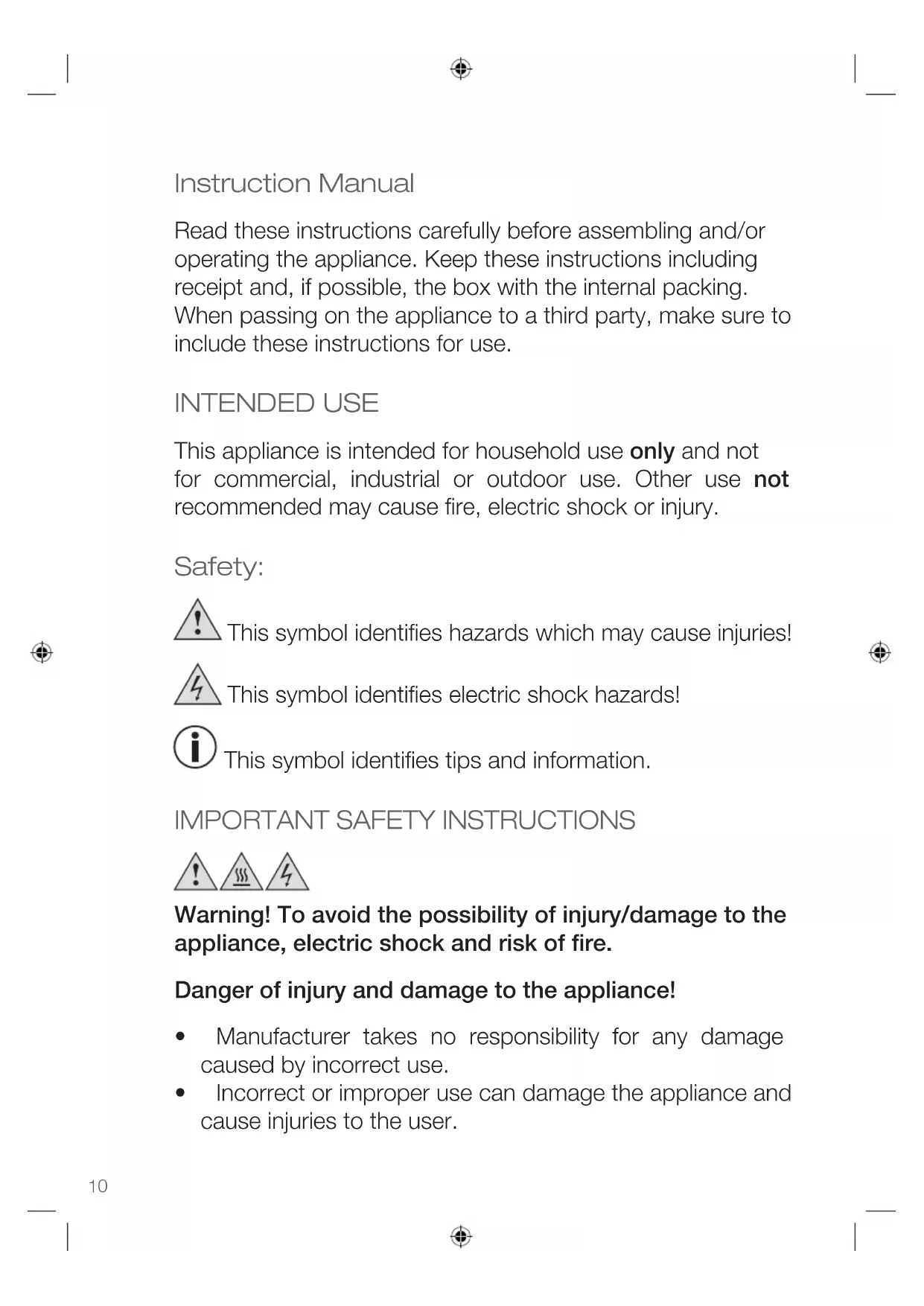 - Incorrect or improper use can damage the appliance and cause injuries to the user.Instruction Manual ENGLISH
