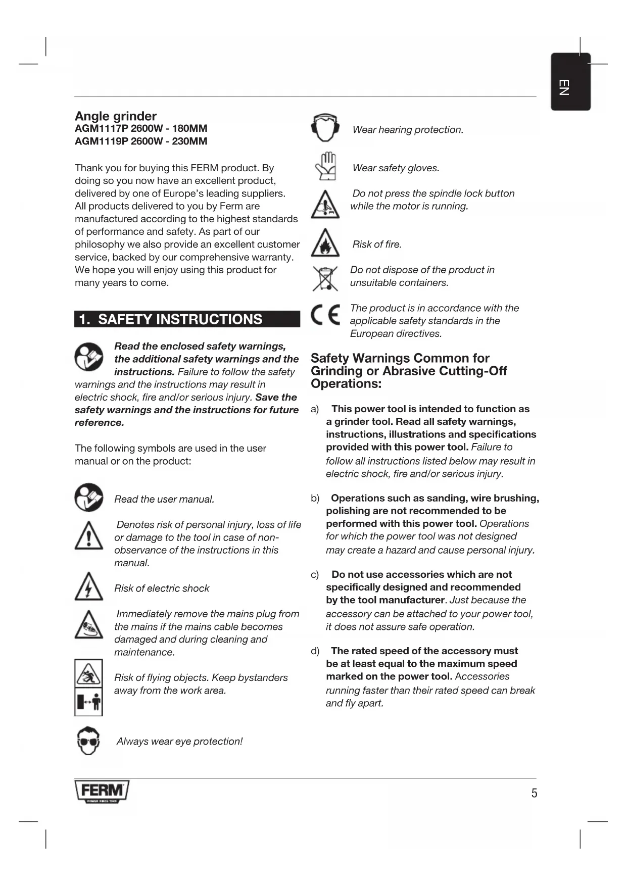 Thank you for buying this FERM product. By doing so you now have an excellent product, delivered by one of Europe's leading suppliers. All products delivered to you by Ferm are manufactured according to the highest standards of performance and safety. As part of our philosophy we also provide an excellent customer service, backed by our comprehensive warranty. We hope you will enjoy using this product for many years to come.