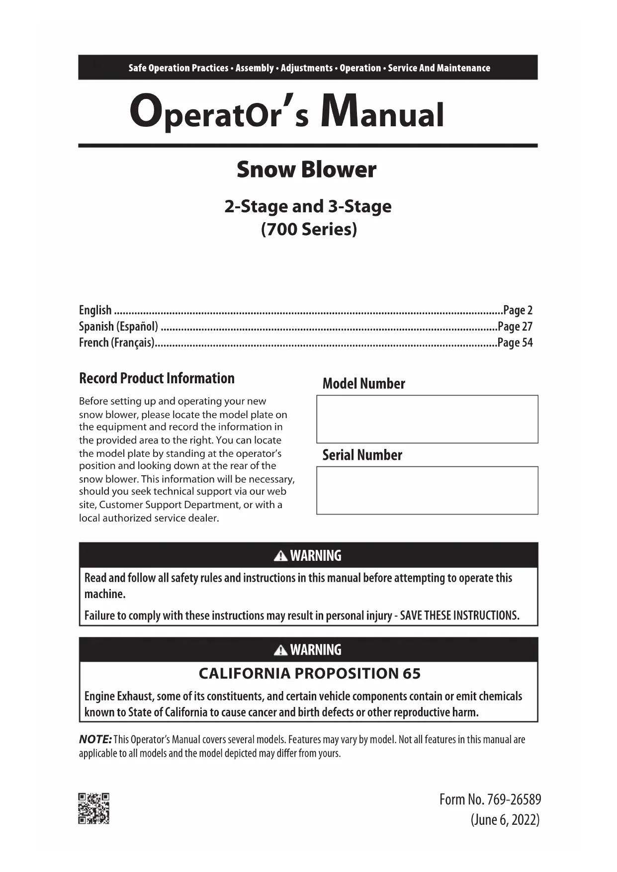 Safe Operation Practices • Assembly • Adjustments • Operation • Service And Maintenance OperatOr’s Manual Form No. 769-26589 (June 6, 2022) Snow Blower 2-Stage and 3-Stage (700 Series) NOTE: This Operator’s Manual covers several models. Features may vary by model. Not all features in this manual are applicable to all models and the model depicted may differ from yours. WARNING Read and follow all safety rules and instructions in this manual before attempting to operate this machine. Failure to comply with these instructions may result in personal injury - SAVE THESE INSTRUCTIONS. WARNING CALIFORNIA PROPOSITION 65 Engine Exhaust, some of its constituents, and certain vehicle components contain or emit chemicals known to State of California to cause cancer and birth defects or other reproductive harm. Record Product Information Before setting up and operating your new snow blower, please locate the model plate on the equipment and record the information in the provided area to the right. You can locate the model plate by standing at the operator’s position and looking down at the rear of the snow blower. This information will be necessary, should you seek technical support via our web site, Customer Support Department, or with a local authorized service dealer. Model Number Serial Number English ......................................................................................................................................Page 2 Spanish (Español) ....................................................................................................................Page 27 French (Français) ......................................................................................................................Page 542