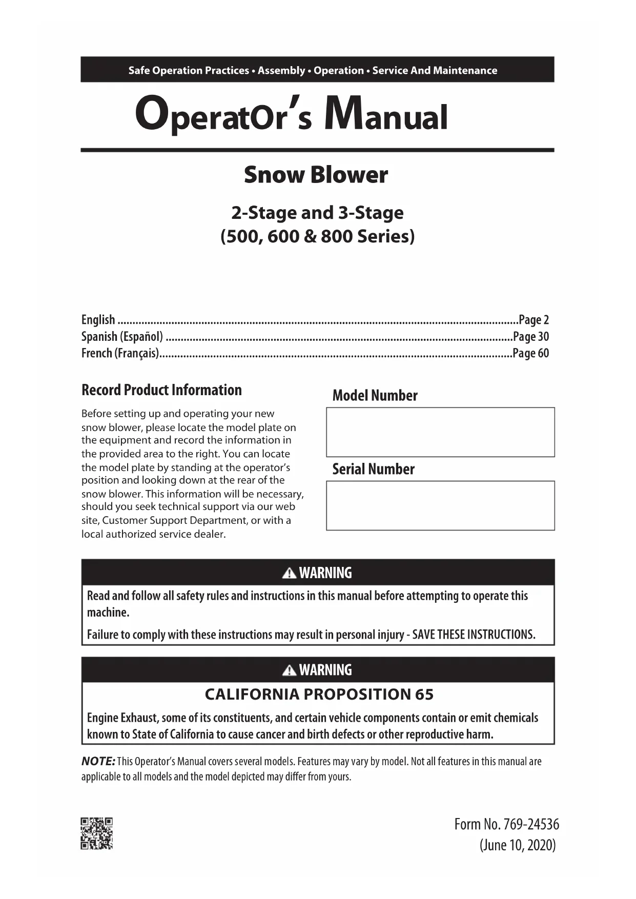 Safe Operation Practices • Assembly • Operation • Service And Maintenance OperatOr’s Manual Form No. 769-24536 (June 10, 2020) Snow Blower 2-Stage and 3-Stage (500, 600 & 800 Series) NOTE: This Operator’s Manual covers several models. Features may vary by model. Not all features in this manual are applicable to all models and the model depicted may differ from yours. WARNING Read and follow all safety rules and instructions in this manual before attempting to operate this machine. Failure to comply with these instructions may result in personal injury - SAVE THESE INSTRUCTIONS. WARNING CALIFORNIA PROPOSITION 65 Engine Exhaust, some of its constituents, and certain vehicle components contain or emit chemicals known to State of California to cause cancer and birth defects or other reproductive harm. Record Product Information Before setting up and operating your new snow blower, please locate the model plate on the equipment and record the information in the provided area to the right. You can locate the model plate by standing at the operator’s position and looking down at the rear of the snow blower. This information will be necessary, should you seek technical support via our web site, Customer Support Department, or with a local authorized service dealer. Model Number Serial Number English ......................................................................................................................................Page 2 Spanish (Español) ....................................................................................................................Page 30 French (Français) ......................................................................................................................Page 602