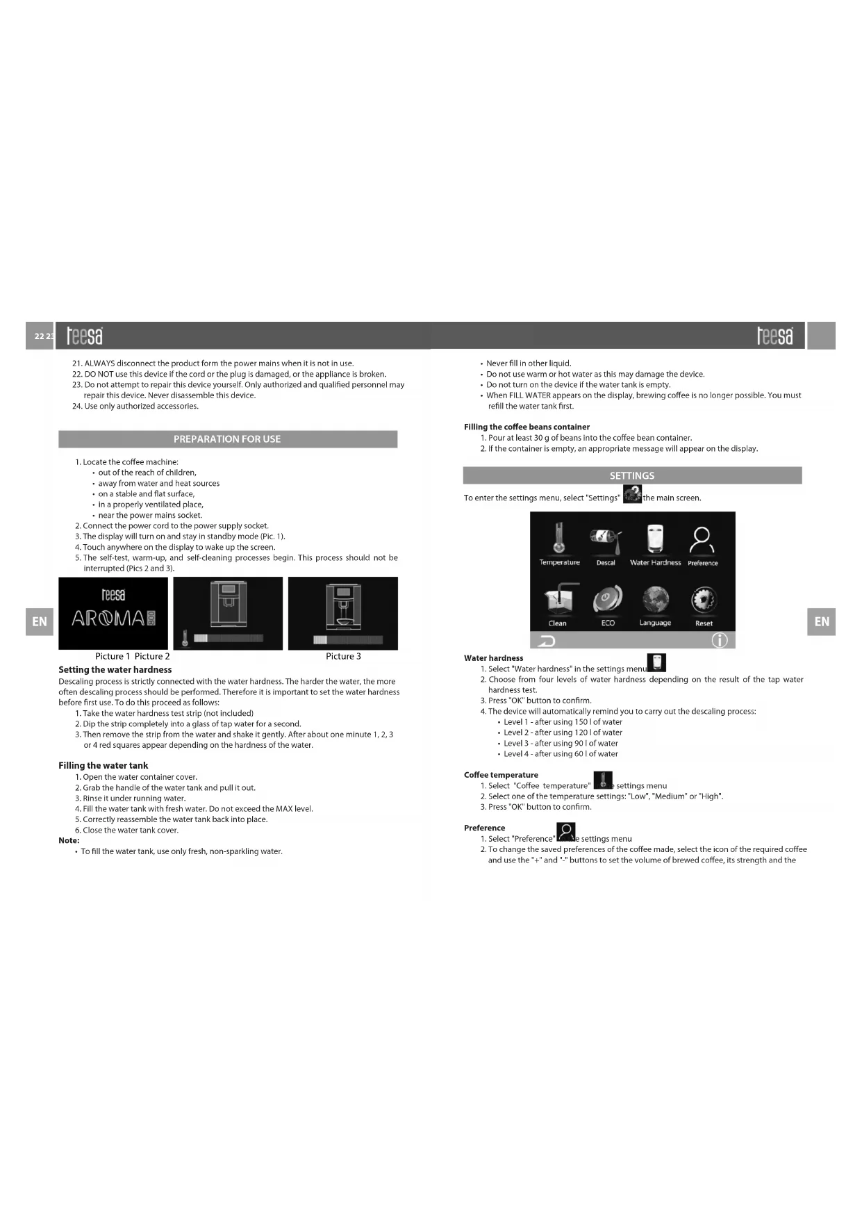 - To ll the water tank, use only fresh, non-sparkling water. Picture 1 Picture 2 Picture 3 SETTINGS To enter the settings menu, select "Settings" from the main screen. Water hardness