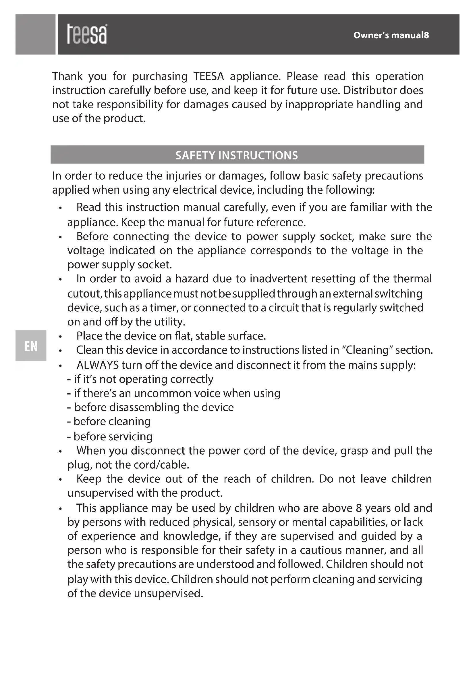 Thank you for purchasing TEESA appliance. Please read this operation instruction carefully before use, and keep it for future use. Distributor does not take responsibility for damages caused by inappropriate handling and use of the product.