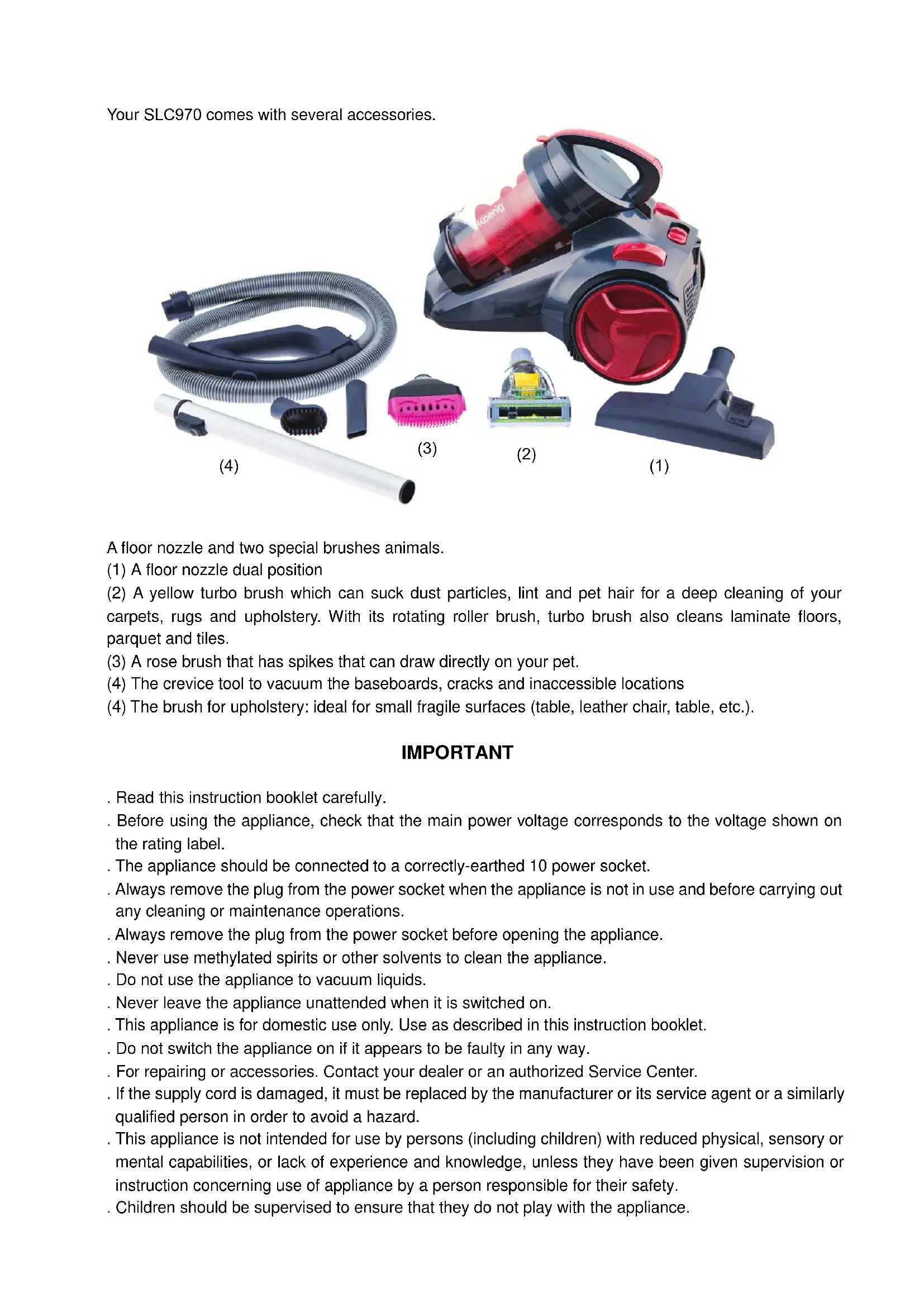 ube I. Safety valve E. Floor brush J . D ustbin button K. Cord rewind buttonYour SLC970 comes with several accessories. A f loor nozzle and two special brushes animals. (1) A floor nozzle dual position (2) A yellow turbo brush which can suck dust particles, lint and pet hair for a deep cleaning of your carpets, rugs and upholstery. With its rotating roller brush, turbo brush also cleans laminate floors, parquet and tiles. (3) A rose brush that has spikes that can draw directly on your pet. (4) The crevice tool to vacuum the baseboards, cracks and inaccessible locations (4) The brush for upholstery: ideal for small fragile surfaces (table, leather chair, table, etc.). IMPORTANT . Read this instruction booklet carefully. . Before using the appliance, check that the main power voltage corresponds to the voltage shown on the rating label. . The appliance should be connected to a correctly-earthed 10 power socket. . Always remove the plug from the power socket when the appliance is not in use and before carrying out any cleaning or maintenance operations. . Always remove the plug from the power socket before opening the appliance. . Never use methylated spirits or other solvents to clean the appliance. . Do not use the appliance to vacuum liquids. . Never leave the appliance unattended when it is switched on. . This appliance is for domestic use only. Use as described in this instruction booklet. . Do not switch the appliance on if it appears to be faulty in any way. . For repairing or accessories. Contact your dealer or an authorized Service Center. . If the supply cord is damaged, it must be replaced by the manufacturer or its service agent or a similarly qualified person in order to avoid a hazard. . This appliance is not intended for use by persons (including children) with reduced physical, sensory or mental capabilities, or lack of experience and knowledge, unless they have been given supervision or instruction concerning use of appliance by a person responsible for their safety. . Children should be supervised to ensure that they do not play with the appliance. (1) (2) (3) (4)D o not remove the plug from Do not run the appliance Do not use the appliance to by pulling the cable the or over the power cabl e v acuum lighted matches, appliance itself cigarette ends or hot ash. Do not use the appliance on Do not obstruct the air Do not use the appliance to wet surfaces.