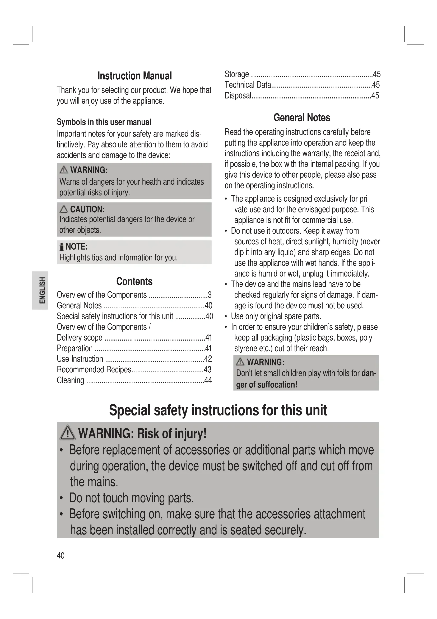 - Disposal General Notes Read the operating instructions carefully before putting the appliance into operation and keep the instructions including the warranty, the receipt and, if possible, the box with the internal packing. If you give this device to other people, please also pass on the operating instructions. p. 45