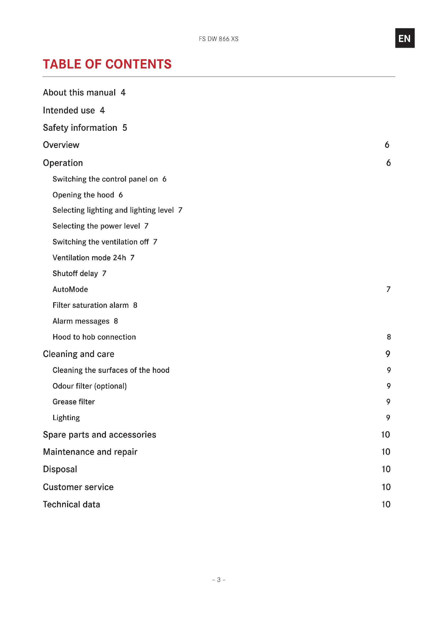 About this manual 4 Intended use 4 Safety information 5 Overview 6 Operation 6 Switching the control panel on 6 Opening the hood 6 Selecting lighting and lighting level 7 Selecting the power level 7 Switching the ventilation off 7 Ventilation mode 24h 7 Shutoff delay 7 AutoMode 7 Filter saturation alarm 8 Alarm messages 8 Hood to hob connection 8 Cleaning and care 9 Cleaning the surfaces of the hood 9 Odour filter (optional) 9 Grease filter 9 Lighting 9 Spare parts and accessories 10 Maintenance and repair 10 Disposal 10 Customer service 10 Technical data 10FS DW 866 XS – 4 –