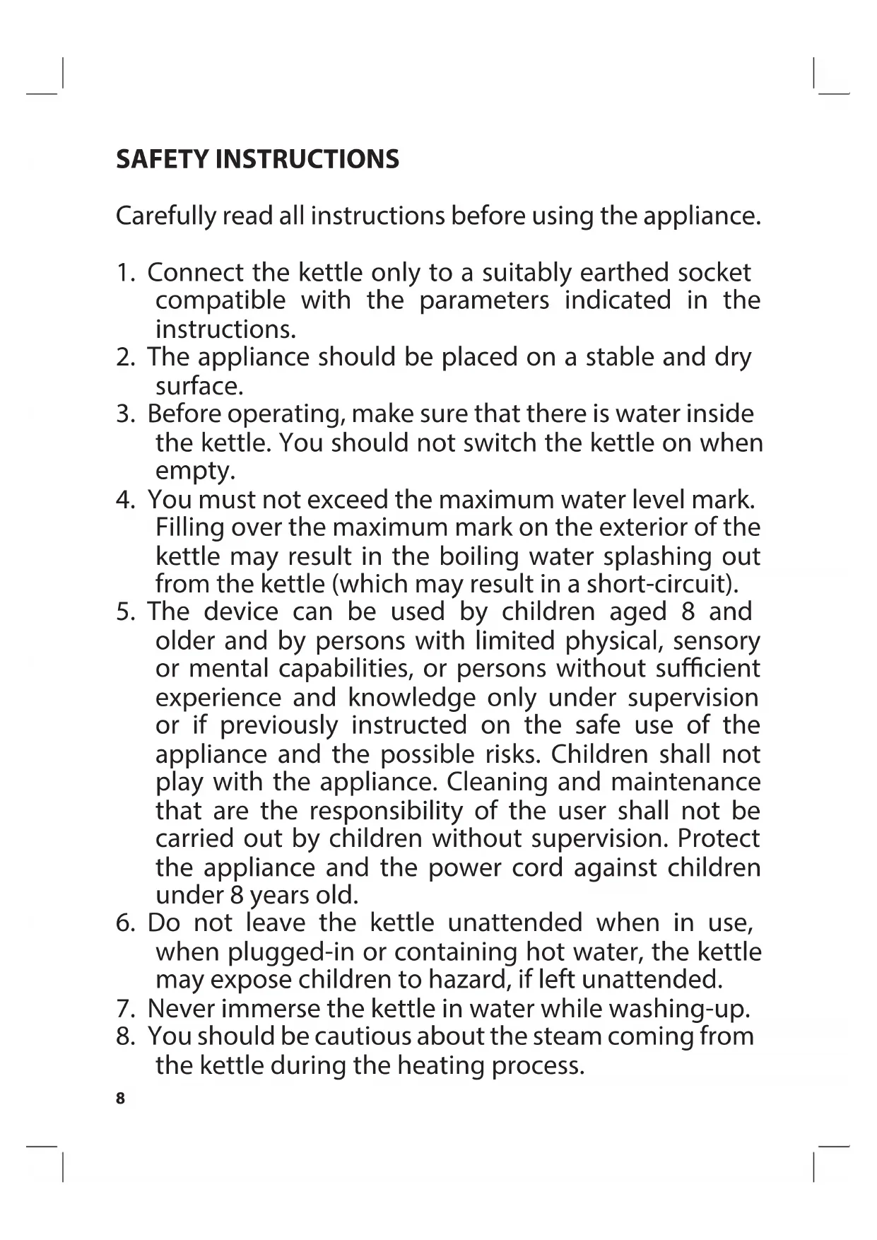 older and by persons with limited physical, sensory or mental capabilities, or persons without sucient experience and knowledge only under supervision or if previously instructed on the safe use of the appliance and the possible risks. Children shall not play with the appliance. Cleaning and maintenance that are the responsibility of the user shall not be carried out by children without supervision. Protect the appliance and the power cord against children under 8 years old.